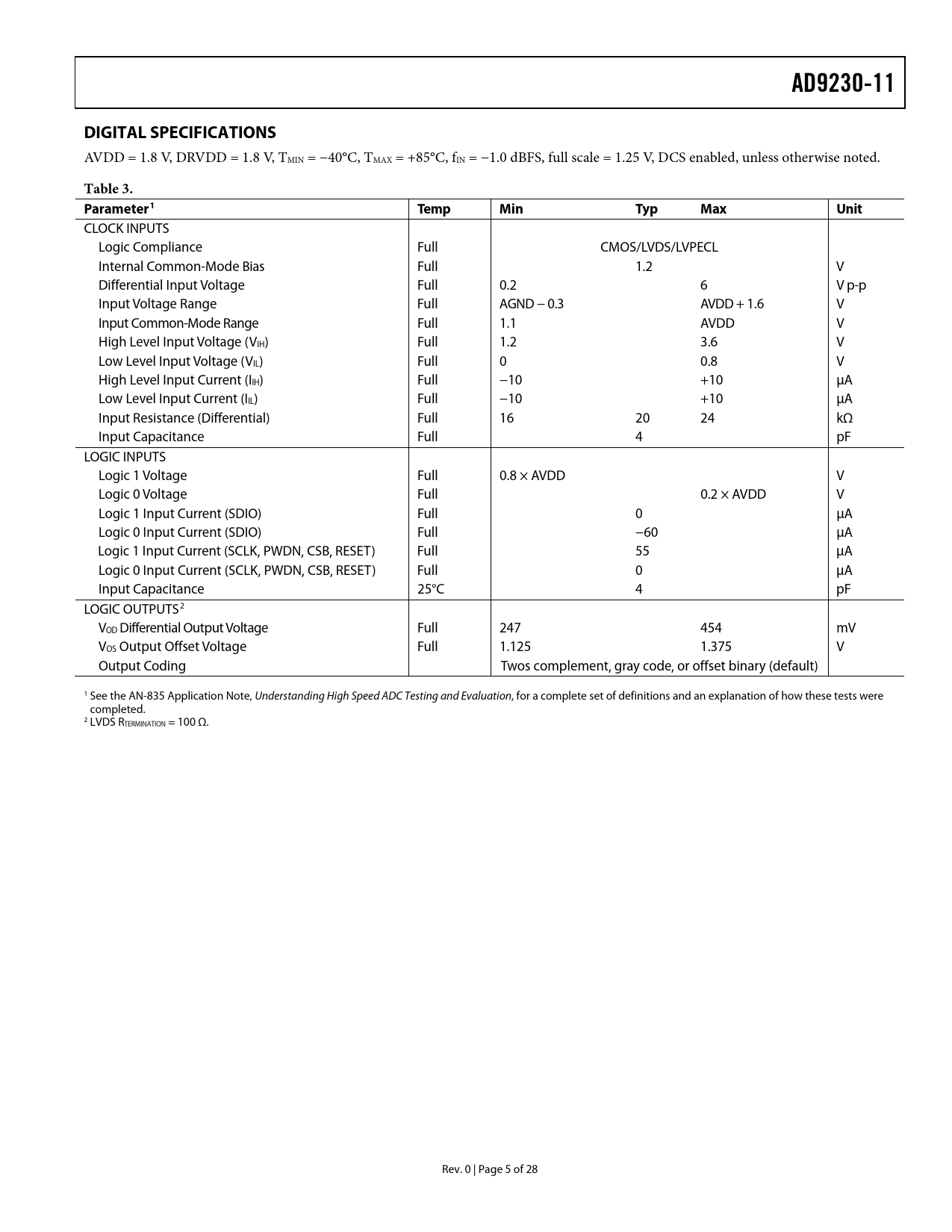 AD9230-11 DIGITAL SPECIFICATIONS Table 3 Parameter1 Temp Min Typ Max Unit