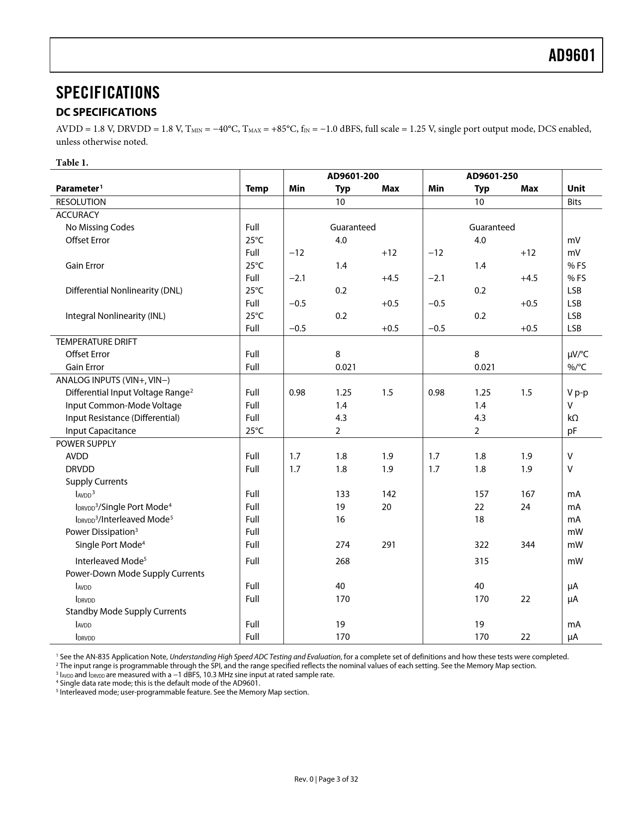 AD9601 SPECIFICATIONS DC SPECIFICATIONS Table 1 AD9601-200 AD9601-250 Parameter1 Temp Min Typ Max Unit