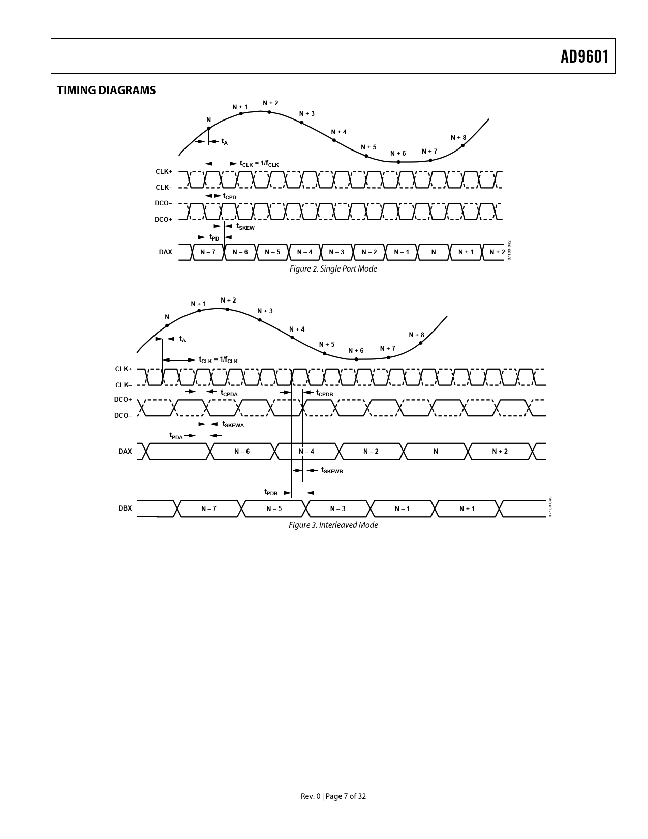 AD9601. TIMING DIAGRAMS. N + 2. N + 1. N + 3. N + 4. N + 8. N + 5. N + 6. N + 7. tCLK = 1/fCLK. CLK+. CLK–. tCPD. DCO–. DCO+. tSKEW. tPD. DAX. N – 7. N – 6