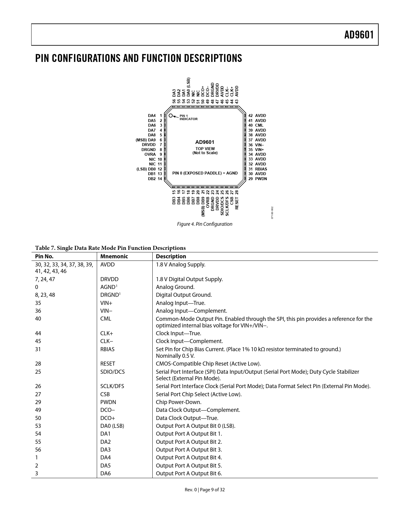link to page 11 link to page 11 AD9601PIN CONFIGURATIONS AND FUNCTION DESCRIPTIONS) B SDLD(+–NDD–+D3210OOGVDKCCKDAAAAIICCRRVLLVDDDDNNDDDDACCA6543210987655555543554444444DA4 1PIN 142 AVDDINDICATORDA5 241 AVDDDA6 340 CMLDA7 439 AVDDDA8 538 AVDD(MSB) DA9 637 AVDDAD9601DRVDD 736 VIN–DRGND 8TOP VIEW35 VIN+OVRA 9(Not to Scale)34 AVDDNIC 1033 AVDDNIC 1132 AVDD(LSB) DB0 1231 RBIASDB1 13PIN 0 (EXPOSED PADDLE) = AGND30 AVDDDB2 1429 PWDN5678011119112222 32 42 52 62 72 823456789BSSBTBBBBBBBDDRCFSEDDDDDDDNDDS)VGVD/ / C EBORROKR 02 SDDI DL 0 MC 0- (SS 10 07 Figure 4. Pin Configuration Table 7. Single Data Rate Mode Pin Function Descriptions Pin No.MnemonicDescription 30, 32, 33, 34, 37, 38, 39, AVDD 1.8 V Analog Supply. 41, 42, 43, 46 7, 24, 47 DRVDD 1.8 V Digital Output Supply. 0 AGND1 Analog Ground. 8, 23, 48 DRGND1 Digital Output Ground. 35 VIN+ Analog Input—True. 36 VIN− Analog Input—Complement. 40 CML Common-Mode Output Pin. Enabled through the SPI, this pin provides a reference for the optimized internal bias voltage for VIN+/VIN−. 44 CLK+ Clock Input—True. 45 CLK− Clock Input—Complement. 31 RBIAS Set Pin for Chip Bias Current. (Place 1% 10 kΩ resistor terminated to ground.) Nominally 0.5 V. 28 RESET CMOS-Compatible Chip Reset (Active Low). 25 SDIO/DCS Serial Port Interface (SPI) Data Input/Output (Serial Port Mode); Duty Cycle Stabilizer Select (External Pin Mode). 26 SCLK/DFS Serial Port Interface Clock (Serial Port Mode); Data Format Select Pin (External Pin Mode). 27 CSB Serial Port Chip Select (Active Low). 29 PWDN Chip Power-Down. 49 DCO− Data Clock Output—Complement. 50 DCO+ Data Clock Output—True. 53 DA0 (LSB) Output Port A Output Bit 0 (LSB). 54 DA1 Output Port A Output Bit 1. 55 DA2 Output Port A Output Bit 2. 56 DA3 Output Port A Output Bit 3. 1 DA4 Output Port A Output Bit 4. 2 DA5 Output Port A Output Bit 5. 3 DA6 Output Port A Output Bit 6. Rev. 0 | Page 9 of 32 Document Outline FEATURES APPLICATIONS FUNCTIONAL BLOCK DIAGRAM GENERAL DESCRIPTION PRODUCT HIGHLIGHTS TABLE OF CONTENTS REVISION HISTORY SPECIFICATIONS DC SPECIFICATIONS AC SPECIFICATIONS DIGITAL SPECIFICATIONS SWITCHING SPECIFICATIONS TIMING DIAGRAMS ABSOLUTE MAXIMUM RATINGS THERMAL RESISTANCE ESD CAUTION PIN CONFIGURATIONS AND FUNCTION DESCRIPTIONS EQUIVALENT CIRCUITS TYPICAL PERFORMANCE CHARACTERISTICS THEORY OF OPERATION ANALOG INPUT AND VOLTAGE REFERENCE Differential Input Configurations CLOCK INPUT CONSIDERATIONS Clock Duty Cycle Considerations Clock Jitter Considerations POWER DISSIPATION AND POWER-DOWN MODE DIGITAL OUTPUTS Digital Outputs and Timing Out-of-Range TIMING—SINGLE PORT MODE TIMING—INTERLEAVED MODE fS/2 Spurious LAYOUT CONSIDERATIONS POWER AND GROUND RECOMMENDATIONS Exposed Paddle Thermal Heat Slug Recommendations CML RBIAS AD9601 CONFIGURATION USING THE SPI HARDWARE INTERFACE CONFIGURATION WITHOUT THE SPI MEMORY MAP READING THE MEMORY MAP TABLE RESERVED LOCATIONS DEFAULT VALUES LOGIC LEVELS EVALUATION BOARD OUTLINE DIMENSIONS ORDERING GUIDE