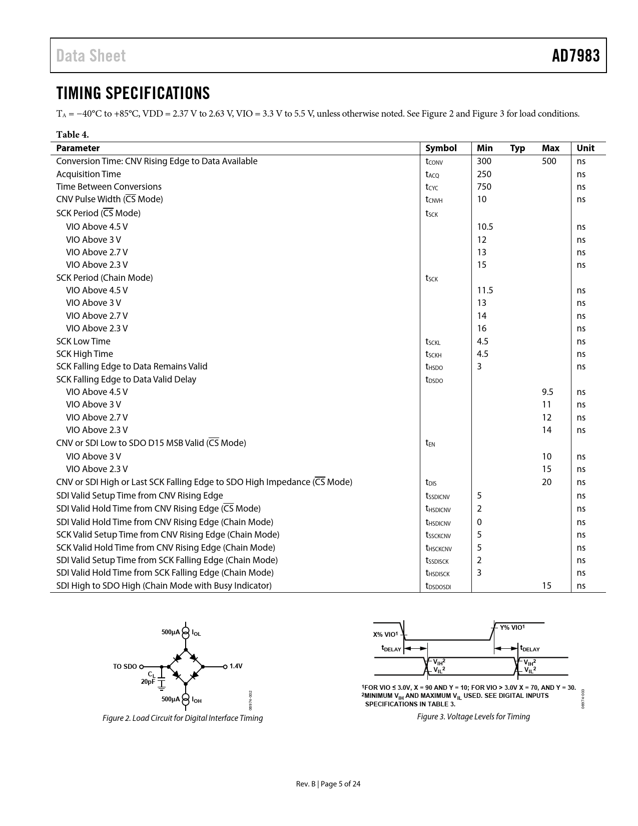 link to page 6 link to page 6 Data SheetAD7983TIMING SPECIFICATIONS TA = −40°C to +85°C, VDD = 2.37 V to 2.63 V, VIO = 3.3 V to 5.5 V, unless otherwise noted. See Figure 2 and Figure 3 for load conditions. Table 4. ParameterSymbol Min Typ Max Unit Conversion Time: CNV Rising Edge to Data Available tCONV 300 500 ns Acquisition Time tACQ 250 ns Time Between Conversions tCYC 750 ns CNV Pulse Width (CS Mode) tCNVH 10 ns SCK Period (CS Mode) tSCK VIO Above 4.5 V 10.5 ns VIO Above 3 V 12 ns VIO Above 2.7 V 13 ns VIO Above 2.3 V 15 ns SCK Period (Chain Mode) tSCK VIO Above 4.5 V 11.5 ns VIO Above 3 V 13 ns VIO Above 2.7 V 14 ns VIO Above 2.3 V 16 ns SCK Low Time tSCKL 4.5 ns SCK High Time tSCKH 4.5 ns SCK Falling Edge to Data Remains Valid tHSDO 3 ns SCK Falling Edge to Data Valid Delay tDSDO VIO Above 4.5 V 9.5 ns VIO Above 3 V 11 ns VIO Above 2.7 V 12 ns VIO Above 2.3 V 14 ns CNV or SDI Low to SDO D15 MSB Valid (CS Mode) tEN VIO Above 3 V 10 ns VIO Above 2.3 V 15 ns CNV or SDI High or Last SCK Falling Edge to SDO High Impedance (CS Mode) tDIS 20 ns SDI Valid Setup Time from CNV Rising Edge tSSDICNV 5 ns SDI Valid Hold Time from CNV Rising Edge (CS Mode) tHSDICNV 2 ns SDI Valid Hold Time from CNV Rising Edge (Chain Mode) tHSDICNV 0 ns SCK Valid Setup Time from CNV Rising Edge (Chain Mode) tSSCKCNV 5 ns SCK Valid Hold Time from CNV Rising Edge (Chain Mode) tHSCKCNV 5 ns SDI Valid Setup Time from SCK Falling Edge (Chain Mode) tSSDISCK 2 ns SDI Valid Hold Time from SCK Falling Edge (Chain Mode) tHSDISCK 3 ns SDI High to SDO High (Chain Mode with Busy Indicator) tDSDOSDI 15 ns Y% VIO1500µAIOLX% VIO1tDELAYtDELAYV 2IHV 2TO SDO1.4VIH2V 2VCILILL20pF1FOR VIO ≤ 3.0V, X = 90 AND Y = 10; FOR VIO > 3.0V X = 70, AND Y = 30. 3 2 00 500µAI 002 MINIMUM VIH AND MAXIMUM VIL USED. SEE DIGITAL INPUTSOH 4- 4- 97 SPECIFICATIONS IN TABLE 3. 97 06 06 Figure 2. Load Circuit for Digital Interface Timing Figure 3. Voltage Levels for Timing Rev. B | Page 5 of 24 Document Outline Features Applications Application Diagram General Description Table of Contents Revision History Specifications Timing Specifications Absolute Maximum Ratings ESD Caution Pin Configurations and Function Descriptions Typical Performance Characteristics Terminology Theory of Operation Circuit Information Converter Operation Transfer Functions Typical Connection Diagram Analog Inputs Driver Amplifier Choice Voltage Reference Input Power Supply Digital Interface CS MODE, 3-Wire Without Busy Indicator CS Mode, 3-Wire with Busy Indicator CS Mode, 4-Wire Without Busy Indicator CS Mode, 4-Wire with Busy Indicator Chain Mode Without Busy Indicator Chain Mode with Busy Indicator Application Hints Layout Evaluating the Performance of the AD7983 Outline Dimensions Ordering Guide