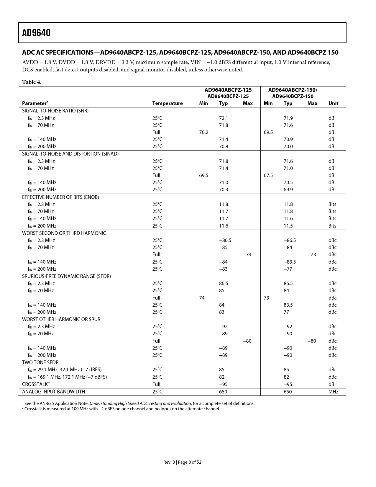 AD9640 ADC AC SPECIFICATIONS—AD9640ABCPZ-125, AD9640BCPZ-125, AD9640ABCPZ-150, AND AD9640BCPZ 150 Table 4 AD9640ABCPZ-125