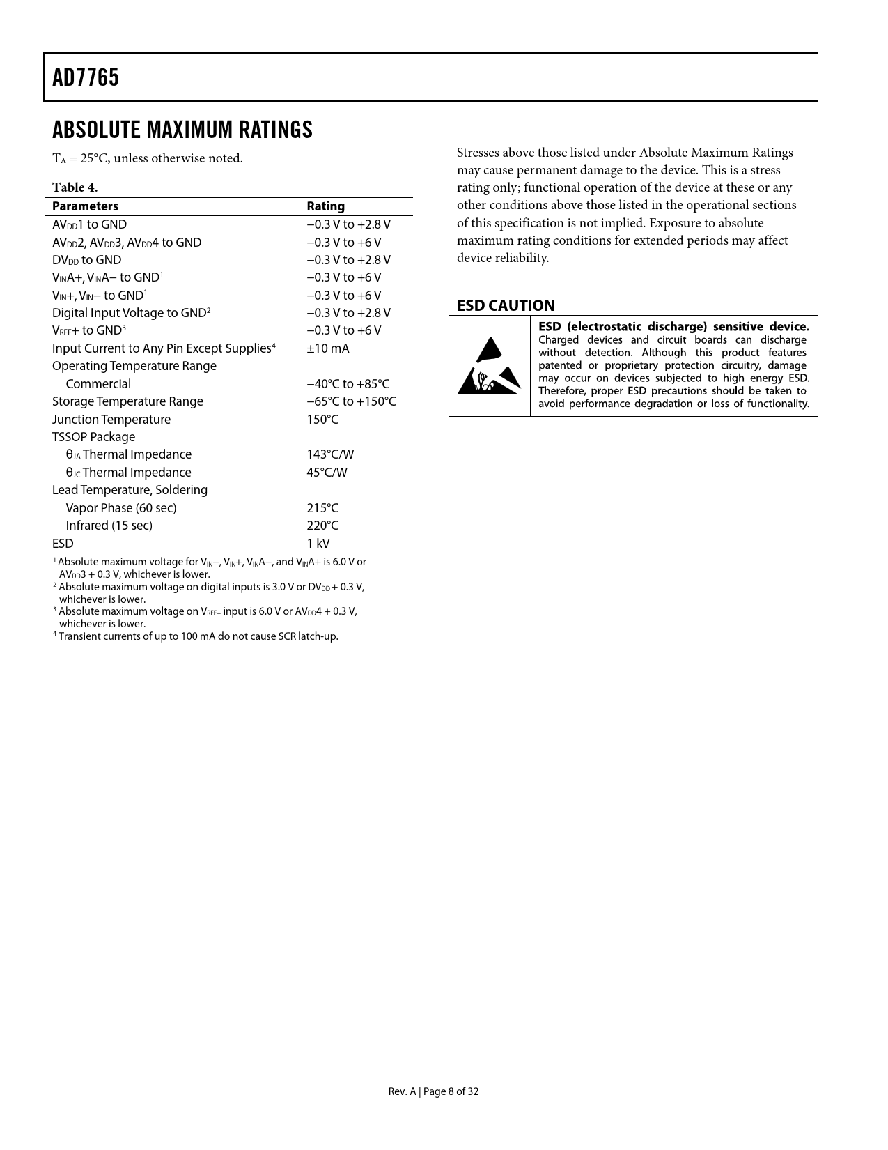 页数 / 页33 / 9 — AD7765. ABSOLUTE MAXIMUM RATINGS. Table 4. Parameters. Rating. ESD CAUTION