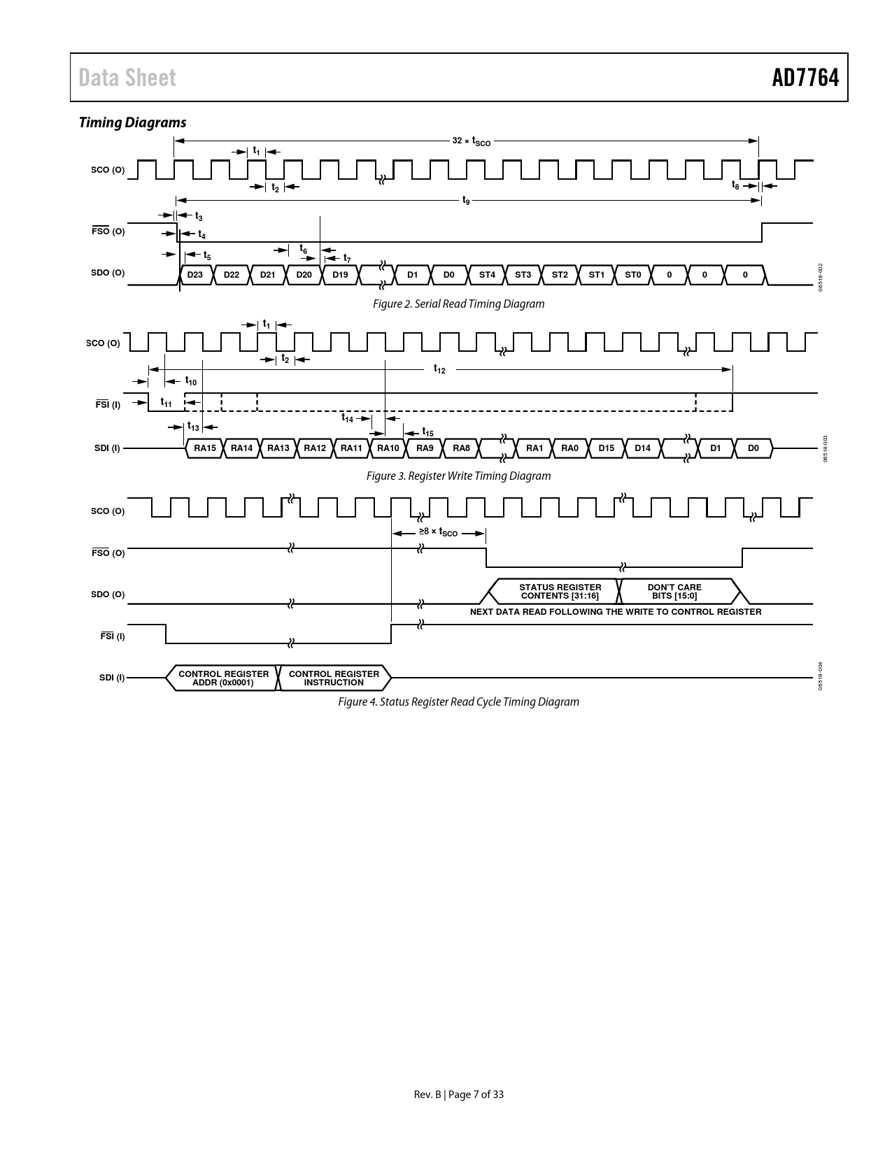Data Sheet. AD7764. Timing Diagrams. 32 × tSCO. SCO (O). FSO (O). SDO (O). D23. D22. D21. D20. D19. ST4. ST3. ST2. ST1. ST0. t12. t10. FSI (I). t11. t14. t13. t15