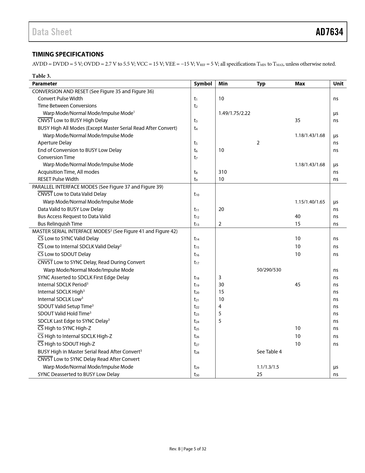 Data Sheet AD7634 TIMING SPECIFICATIONS Table 3 Parameter Symbol Min Typ Max Unit