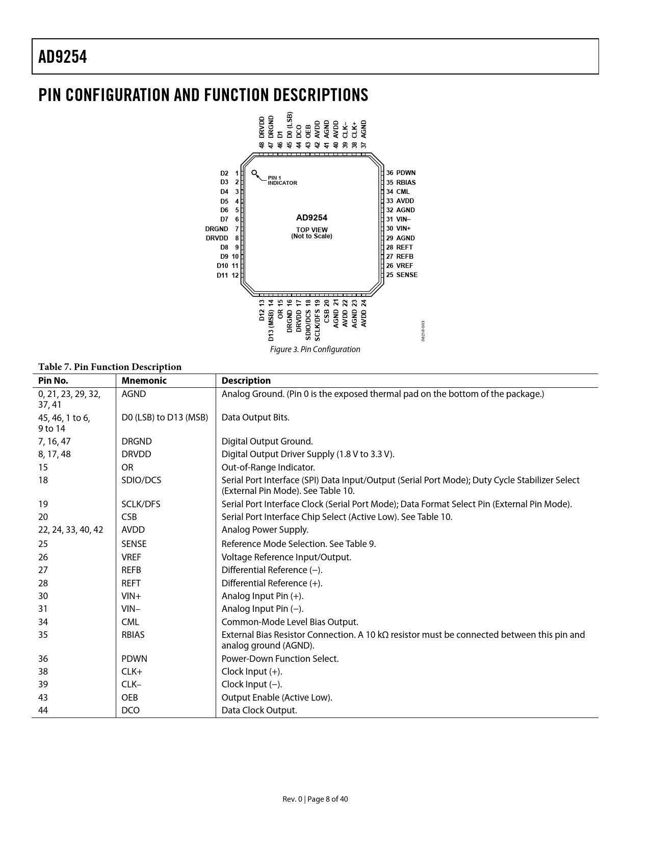 link to page 20 link to page 20 link to page 17 AD9254PIN CONFIGURATION AND FUNCTION DESCRIPTIONS)DDBDNSDDD–+DVGL (OBDNDKKNDRDRD1D0DCOEAVAGAVCLCLAG484746454443424140393837D2 136 PDWNPIN 1D3 2INDICATOR35 RBIASD4 334 CMLD5 433 AVDDD6 532 AGNDD7 6AD925431 VIN–DRGND 7TOP VIEW30 VIN+DRVDD 8(Not to Scale)29 AGNDD8 928 REFTD9 1027 REFBD10 1126 VREFD11 1225 SENSE1314151617181920212223242) BDSBD1SORNDDCFSNDDDNDDDMV/D/DCSAGAVAGAV 03 0 DRGDRIOLK 6- CD13 (SDS 621 0 Figure 3. Pin Configuration Table 7. Pin Function Description Pin No.MnemonicDescription 0, 21, 23, 29, 32, AGND Analog Ground. (Pin 0 is the exposed thermal pad on the bottom of the package.) 37, 41 45, 46, 1 to 6, D0 (LSB) to D13 (MSB) Data Output Bits. 9 to 14 7, 16, 47 DRGND Digital Output Ground. 8, 17, 48 DRVDD Digital Output Driver Supply (1.8 V to 3.3 V). 15 OR Out-of-Range Indicator. 18 SDIO/DCS Serial Port Interface (SPI) Data Input/Output (Serial Port Mode); Duty Cycle Stabilizer Select (External Pin Mode). See Table 10. 19 SCLK/DFS Serial Port Interface Clock (Serial Port Mode); Data Format Select Pin (External Pin Mode). 20 CSB Serial Port Interface Chip Select (Active Low). See Table 10. 22, 24, 33, 40, 42 AVDD Analog Power Supply. 25 SENSE Reference Mode Selection. See Table 9. 26 VREF Voltage Reference Input/Output. 27 REFB Differential Reference (−). 28 REFT Differential Reference (+). 30 VIN+ Analog Input Pin (+). 31 VIN– Analog Input Pin (−). 34 CML Common-Mode Level Bias Output. 35 RBIAS External Bias Resistor Connection. A 10 kΩ resistor must be connected between this pin and analog ground (AGND). 36 PDWN Power-Down Function Select. 38 CLK+ Clock Input (+). 39 CLK– Clock Input (−). 43 OEB Output Enable (Active Low). 44 DCO Data Clock Output. Rev. 0 | Page 8 of 40 Document Outline FEATURES APPLICATIONS GENERAL DESCRIPTION FUNCTIONAL BLOCK DIAGRAM PRODUCT HIGHLIGHTS REVISION HISTORY SPECIFICATIONS DC SPECIFICATIONS AC SPECIFICATIONS DIGITAL SPECIFICATIONS SWITCHING SPECIFICATIONS TIMING DIAGRAM ABSOLUTE MAXIMUM RATINGS THERMAL RESISTANCE ESD CAUTION PIN CONFIGURATION AND FUNCTION DESCRIPTIONS EQUIVALENT CIRCUITS TYPICAL PERFORMANCE CHARACTERISTICS THEORY OF OPERATION ANALOG INPUT CONSIDERATIONS DIFFERENTIAL INPUT CONFIGURATIONS VOLTAGE REFERENCE CLOCK INPUT CONSIDERATIONS JITTER CONSIDERATIONS POWER DISSIPATION AND STANDBY MODE DIGITAL OUTPUTS TIMING SERIAL PORT INTERFACE (SPI) MEMORY MAP READING THE MEMORY MAP REGISTER TABLE MEMORY MAP REGISTER TABLE LAYOUT CONSIDERATIONS POWER AND GROUND RECOMMENDATIONS CML RBIAS REFERENCE DECOUPLING EVALUATION BOARD POWER SUPPLIES INPUT SIGNALS OUTPUT SIGNALS DEFAULT OPERATION AND JUMPER SELECTION SETTINGS ALTERNATIVE CLOCK CONFIGURATIONS ALTERNATIVE ANALOG INPUT DRIVE CONFIGURATION SCHEMATICS EVALUATION BOARD LAYOUT BILL OF MATERIALS OUTLINE DIMENSIONS ORDERING GUIDE