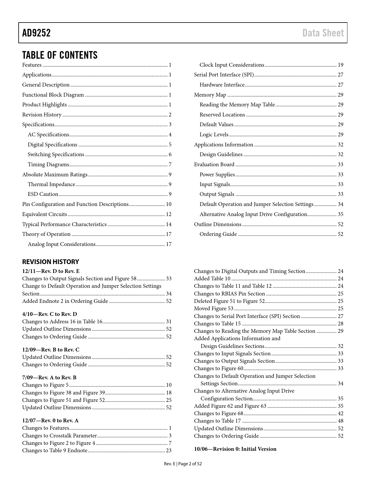 AD9252 Data Sheet TABLE OF CONTENTS REVISION HISTORY 12/11—Rev D to Rev E 4/10—Rev C to Rev D 12/09—Rev B to Rev C