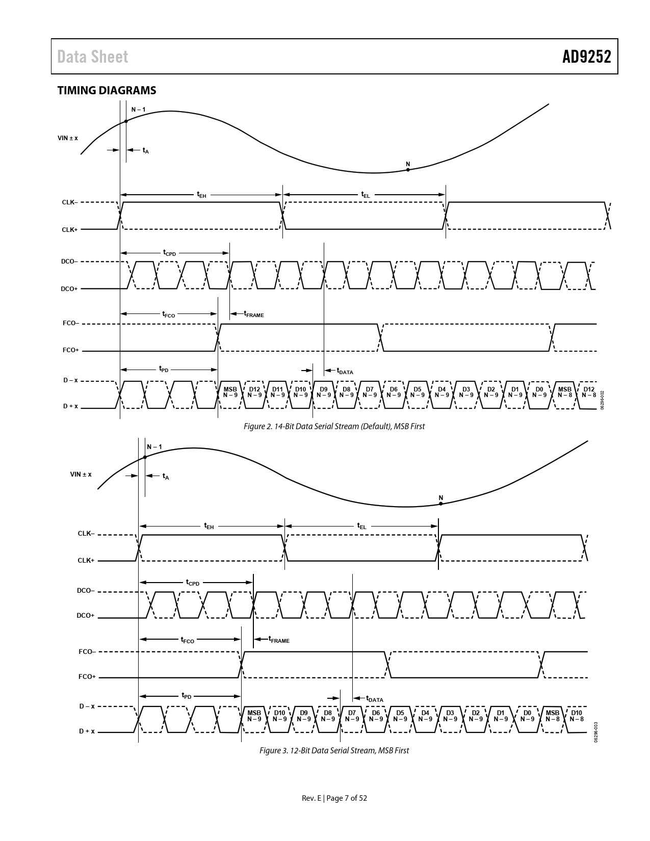 Data Sheet. AD9252. TIMING DIAGRAMS. N – 1. VIN ± x. tEH. tEL. CLK–. CLK+. tCPD. DCO–. DCO+. FCO. FRAME. FCO–. FCO+. tPD. tDATA. D – x. MSB. D12. D11. D10. N – 9