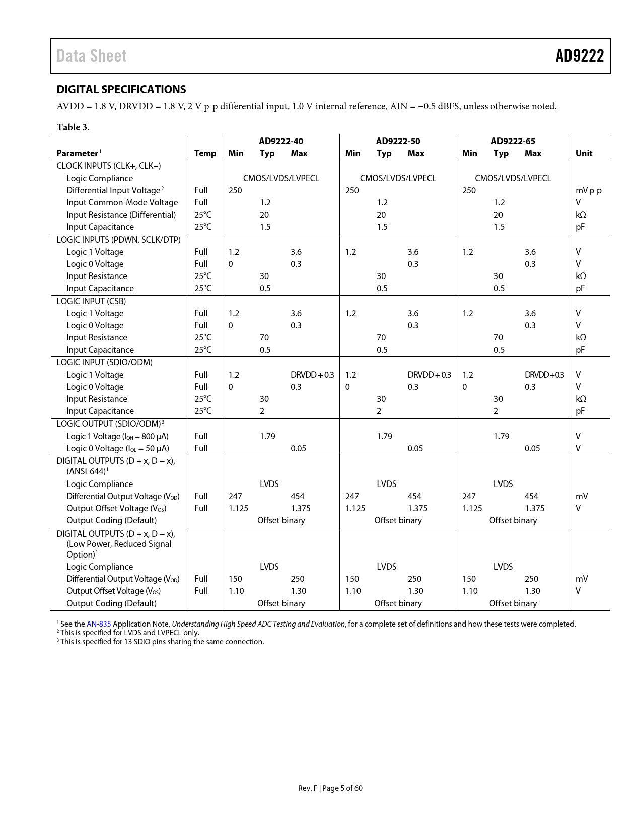 | 页数 / 页 | 61 / 6 — Data Sheet. AD9222. DIGITAL SPECIFICATIONS. Table 3. AD9222-40. … |