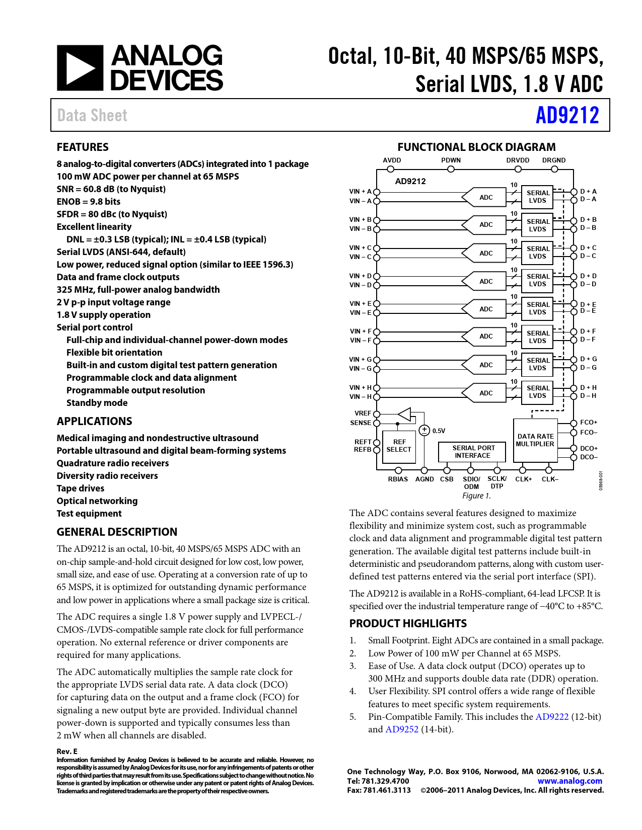 Octal, 10-Bit, 40 MSPS/65 MSPS,. Serial LVDS, 1.8 V ADC. Data Sheet. AD9212. FEATURES. FUNCTIONAL BLOCK DIAGRAM. AVDD. PDWN. DRVDD. DRGND