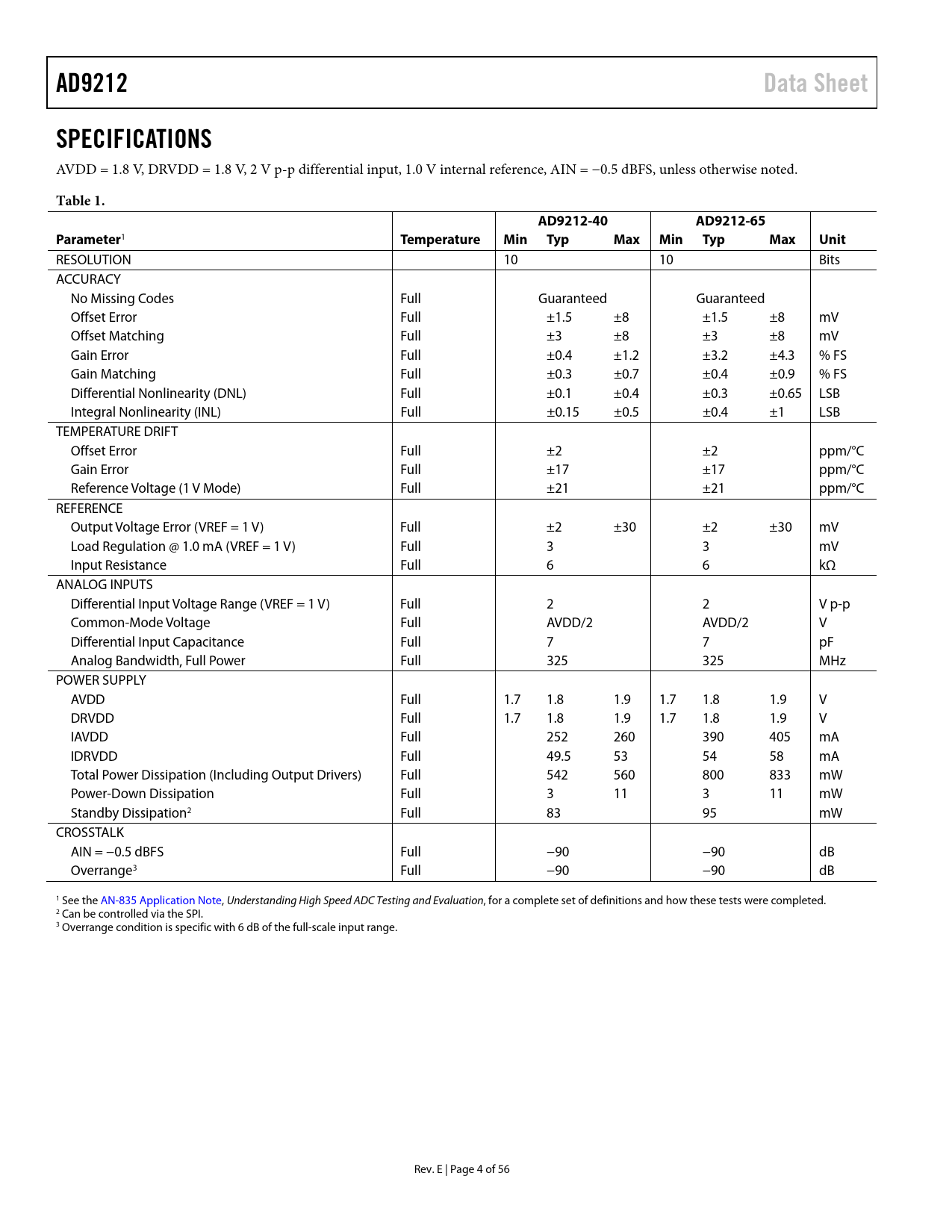 link to page 6 link to page 6 link to page 6 link to page 5 link to page 5 link to page 5 AD9212Data SheetSPECIFICATIONS AVDD = 1.8 V, DRVDD = 1.8 V, 2 V p-p differential input, 1.0 V internal reference, AIN = −0.5 dBFS, unless otherwise noted. Table 1.AD9212-40AD9212-65Parameter 1 TemperatureMinTypMaxMinTypMaxUnit RESOLUTION 10 10 Bits ACCURACY No Missing Codes Full Guaranteed Guaranteed Offset Error Full ±1.5 ±8 ±1.5 ±8 mV Offset Matching Full ±3 ±8 ±3 ±8 mV Gain Error Full ±0.4 ±1.2 ±3.2 ±4.3 % FS Gain Matching Full ±0.3 ±0.7 ±0.4 ±0.9 % FS Differential Nonlinearity (DNL) Full ±0.1 ±0.4 ±0.3 ±0.65 LSB Integral Nonlinearity (INL) Full ±0.15 ±0.5 ±0.4 ±1 LSB TEMPERATURE DRIFT Offset Error Full ±2 ±2 ppm/°C Gain Error Full ±17 ±17 ppm/°C Reference Voltage (1 V Mode) Full ±21 ±21 ppm/°C REFERENCE Output Voltage Error (VREF = 1 V) Full ±2 ±30 ±2 ±30 mV Load Regulation @ 1.0 mA (VREF = 1 V) Full 3 3 mV Input Resistance Full 6 6 kΩ ANALOG INPUTS Differential Input Voltage Range (VREF = 1 V) Full 2 2 V p-p Common-Mode Voltage Full AVDD/2 AVDD/2 V Differential Input Capacitance Full 7 7 pF Analog Bandwidth, Full Power Full 325 325 MHz POWER SUPPLY AVDD Full 1.7 1.8 1.9 1.7 1.8 1.9 V DRVDD Full 1.7 1.8 1.9 1.7 1.8 1.9 V IAVDD Full 252 260 390 405 mA IDRVDD Full 49.5 53 54 58 mA Total Power Dissipation (Including Output Drivers) Full 542 560 800 833 mW Power-Down Dissipation Full 3 11 3 11 mW Standby Dissipation2 Full 83 95 mW CROSSTALK AIN = −0.5 dBFS Full −90 −90 dB Overrange3 Full −90 −90 dB 1 See the AN-835 Application Note, Understanding High Speed ADC Testing and Evaluation, for a complete set of definitions and how these tests were completed. 2 Can be controlled via the SPI. 3 Overrange condition is specific with 6 dB of the full-scale input range. Rev. E | Page 4 of 56 Document Outline Features Applications General Description Functional Block Diagram Product Highlights Revision History Specifications AC Specifications Digital Specifications Switching Specifications Timing Diagrams Absolute Maximum Ratings Thermal Impedance ESD Caution Pin Configuration and Function Descriptions Equivalent Circuits Typical Performance Characteristics Theory of Operation Analog Input Considerations Differential Input Configurations Single-Ended Input Configuration Clock Input Considerations Clock Duty Cycle Considerations Clock Jitter Considerations Power Dissipation and Power-Down Mode Digital Outputs and Timing SDIO/ODM Pin SCLK/DTP Pin CSB Pin RBIAS Pin Voltage Reference Internal Reference Operation External Reference Operation Serial Port Interface (SPI) Hardware Interface Memory Map Reading the Memory Map Table Reserved Locations Default Values Logic Levels Applications Information Design Guidelines Power and Ground Recommendations Exposed Paddle Thermal Heat Slug Recommendations Evaluation Board Power Supplies Input Signals Output Signals Default Operation and Jumper Selection Settings Alternative Analog Input Drive Configuration Outline Dimensions Ordering Guide