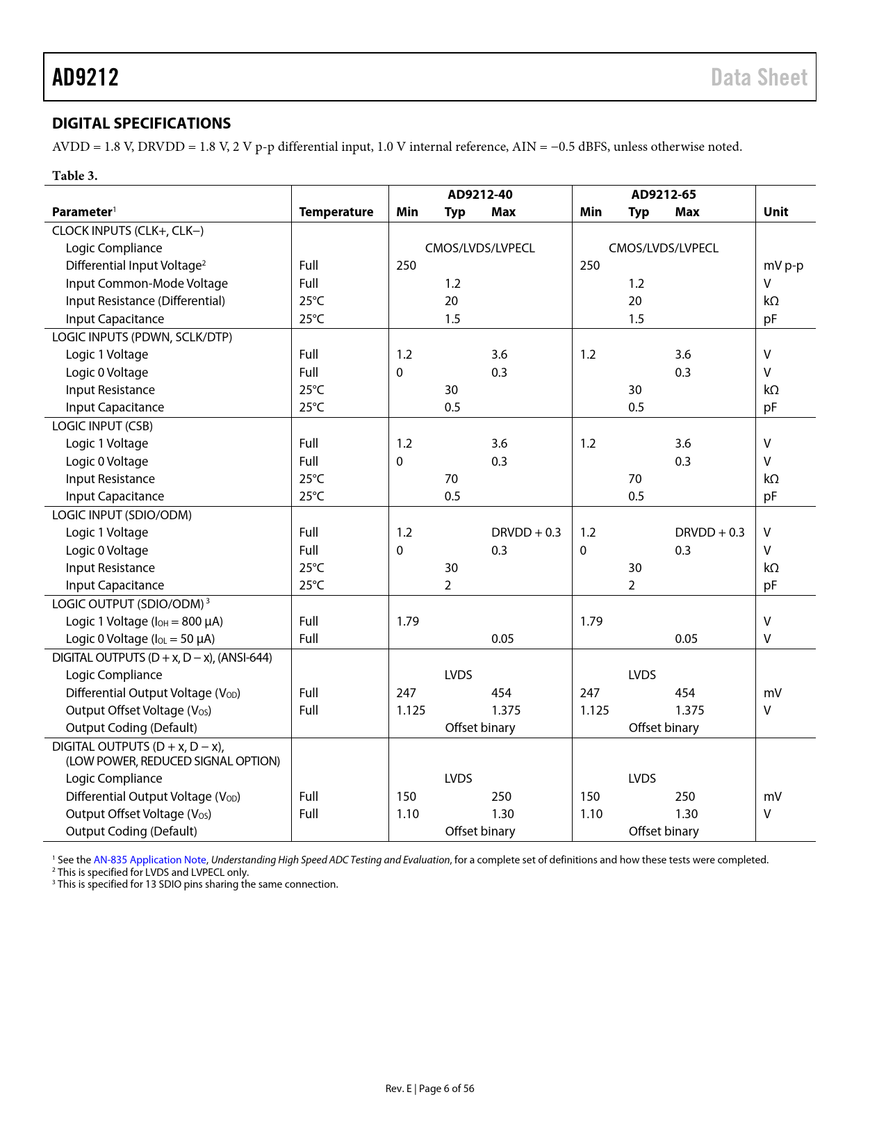 页数 / 页57 / 7 — AD9212. Data Sheet. DIGITAL SPECIFICATIONS. Table 3. AD9212-40. …