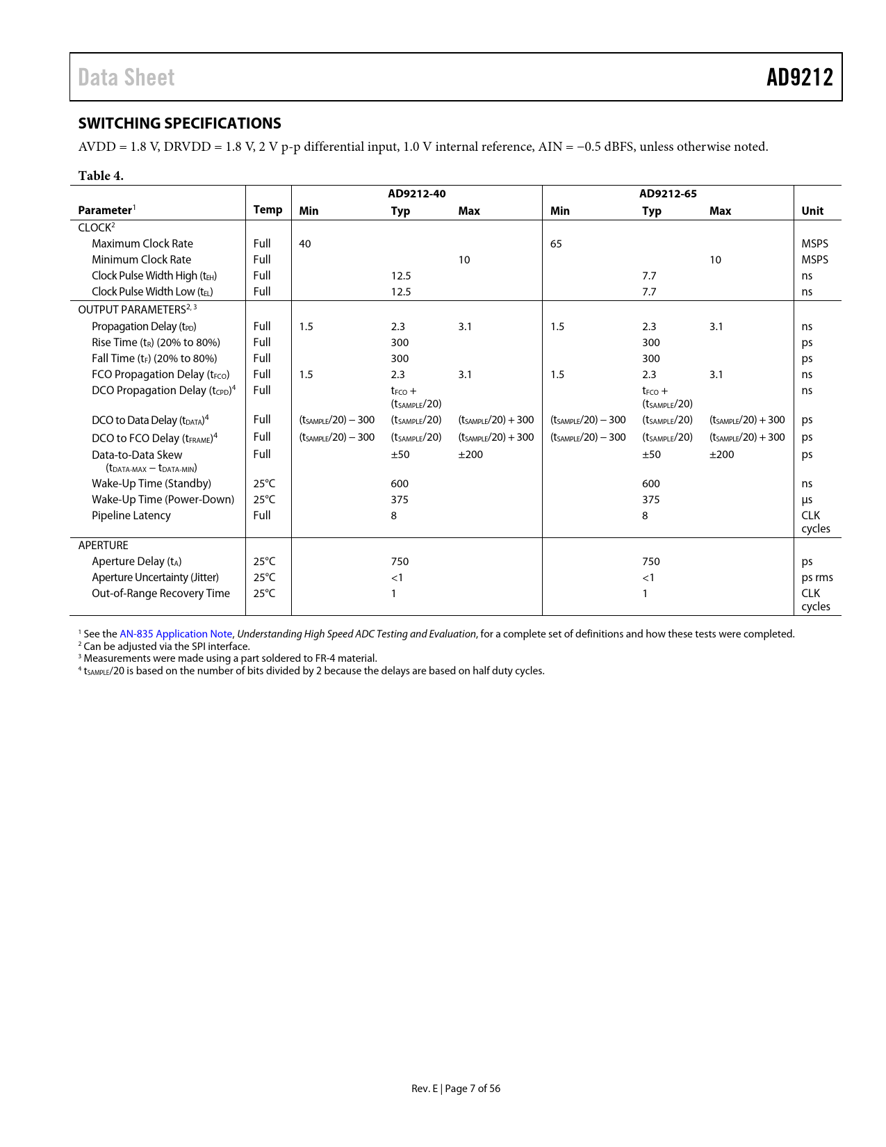 link to page 12 link to page 12 link to page 12 link to page 12 link to page 8 link to page 8 link to page 8 link to page 8 link to page 8 link to page 8 Data SheetAD9212SWITCHING SPECIFICATIONS AVDD = 1.8 V, DRVDD = 1.8 V, 2 V p-p differential input, 1.0 V internal reference, AIN = −0.5 dBFS, unless otherwise noted. Table 4.AD9212-40 AD9212-65Parameter 1 TempMin TypMax Min TypMax Unit CLOCK2 Maximum Clock Rate Full 40 65 MSPS Minimum Clock Rate Full 10 10 MSPS Clock Pulse Width High (tEH) Full 12.5 7.7 ns Clock Pulse Width Low (tEL) Full 12.5 7.7 ns OUTPUT PARAMETERS2, 3 Propagation Delay (tPD) Full 1.5 2.3 3.1 1.5 2.3 3.1 ns Rise Time (tR) (20% to 80%) Full 300 300 ps Fall Time (tF) (20% to 80%) Full 300 300 ps FCO Propagation Delay (tFCO) Full 1.5 2.3 3.1 1.5 2.3 3.1 ns DCO Propagation Delay (tCPD)4 Full tFCO + tFCO + ns (tSAMPLE/20) (tSAMPLE/20) DCO to Data Delay (tDATA)4 Full (tSAMPLE/20) − 300 (tSAMPLE/20) (tSAMPLE/20) + 300 (tSAMPLE/20) − 300 (tSAMPLE/20) (tSAMPLE/20) + 300 ps DCO to FCO Delay (tFRAME)4 Full (tSAMPLE/20) − 300 (tSAMPLE/20) (tSAMPLE/20) + 300 (tSAMPLE/20) − 300 (tSAMPLE/20) (tSAMPLE/20) + 300 ps Data-to-Data Skew Full ±50 ±200 ±50 ±200 ps (tDATA-MAX − tDATA-MIN) Wake-Up Time (Standby) 25°C 600 600 ns Wake-Up Time (Power-Down) 25°C 375 375 μs Pipeline Latency Full 8 8 CLK cycles APERTURE Aperture Delay (tA) 25°C 750 750 ps Aperture Uncertainty (Jitter) 25°C <1 <1 ps rms Out-of-Range Recovery Time 25°C 1 1 CLK cycles 1 See the AN-835 Application Note, Understanding High Speed ADC Testing and Evaluation, for a complete set of definitions and how these tests were completed. 2 Can be adjusted via the SPI interface. 3 Measurements were made using a part soldered to FR-4 material. 4 tSAMPLE/20 is based on the number of bits divided by 2 because the delays are based on half duty cycles. Rev. E | Page 7 of 56 Document Outline Features Applications General Description Functional Block Diagram Product Highlights Revision History Specifications AC Specifications Digital Specifications Switching Specifications Timing Diagrams Absolute Maximum Ratings Thermal Impedance ESD Caution Pin Configuration and Function Descriptions Equivalent Circuits Typical Performance Characteristics Theory of Operation Analog Input Considerations Differential Input Configurations Single-Ended Input Configuration Clock Input Considerations Clock Duty Cycle Considerations Clock Jitter Considerations Power Dissipation and Power-Down Mode Digital Outputs and Timing SDIO/ODM Pin SCLK/DTP Pin CSB Pin RBIAS Pin Voltage Reference Internal Reference Operation External Reference Operation Serial Port Interface (SPI) Hardware Interface Memory Map Reading the Memory Map Table Reserved Locations Default Values Logic Levels Applications Information Design Guidelines Power and Ground Recommendations Exposed Paddle Thermal Heat Slug Recommendations Evaluation Board Power Supplies Input Signals Output Signals Default Operation and Jumper Selection Settings Alternative Analog Input Drive Configuration Outline Dimensions Ordering Guide