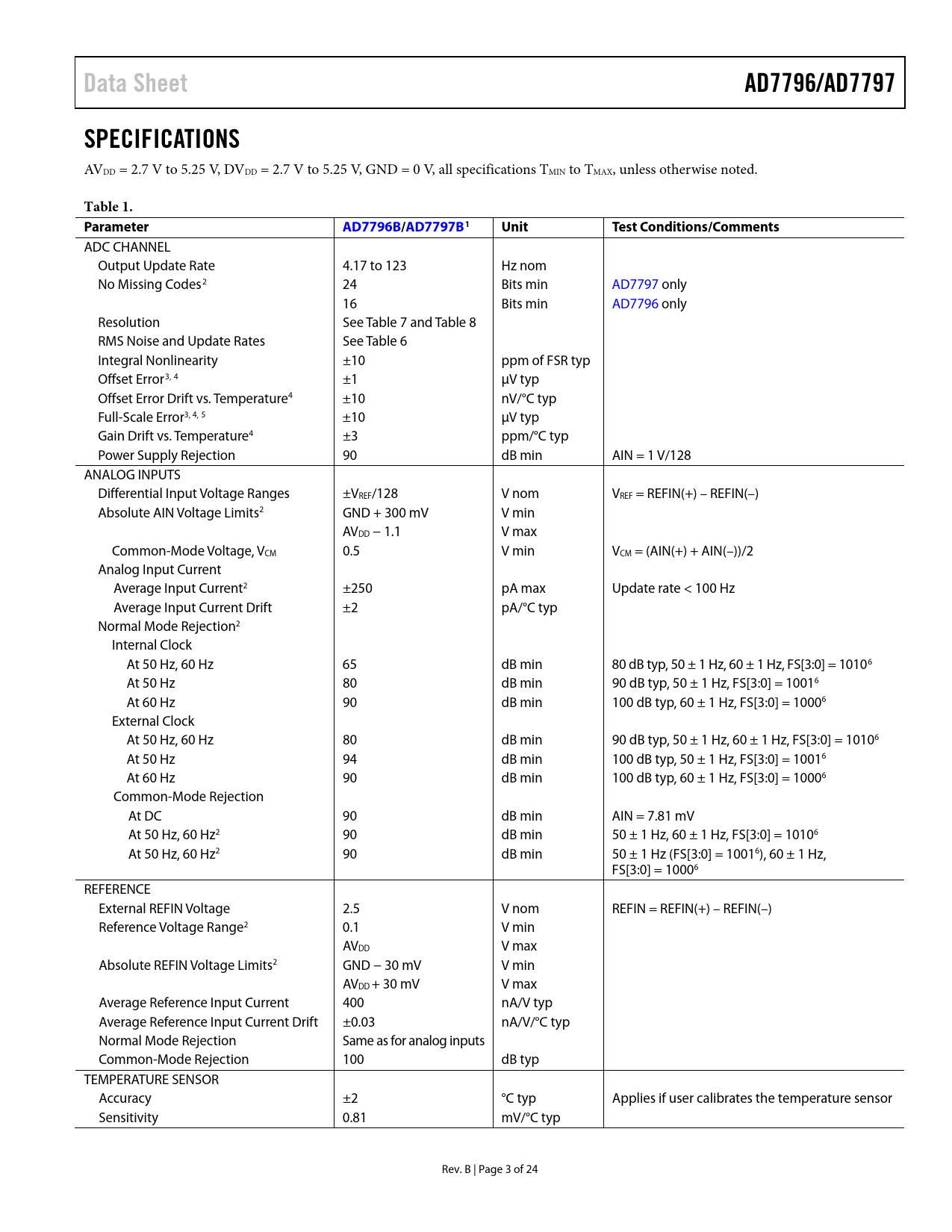 页数 / 页24 / 3 — Data Sheet. AD7796/AD7797. SPECIFICATIONS. Table 1. Parameter. AD7796B/. …