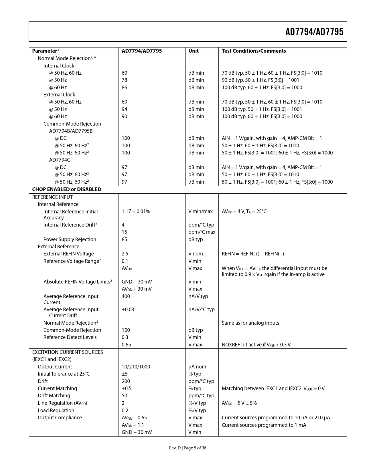 link to page 7 link to page 7 link to page 7 link to page 7 link to page 7 link to page 7 link to page 7 link to page 7 link to page 7 link to page 7 link to page 7 AD7794/AD7795Parameter 1 AD7794/AD7795UnitTest Conditions/Comments Normal Mode Rejection2, 6 Internal Clock @ 50 Hz, 60 Hz 60 dB min 70 dB typ, 50 ± 1 Hz, 60 ± 1 Hz, FS[3:0] = 1010 @ 50 Hz 78 dB min 90 dB typ, 50 ± 1 Hz, FS[3:0] = 1001 @ 60 Hz 86 dB min 100 dB typ, 60 ± 1 Hz, FS[3:0] = 1000 External Clock @ 50 Hz, 60 Hz 60 dB min 70 dB typ, 50 ± 1 Hz, 60 ± 1 Hz, FS[3:0] = 1010 @ 50 Hz 94 dB min 100 dB typ, 50 ± 1 Hz, FS[3:0] = 1001 @ 60 Hz 90 dB min 100 dB typ, 60 ± 1 Hz, FS[3:0] = 1000 Common-Mode Rejection AD7794B/AD7795B @ DC 100 dB min AIN = 1 V/gain, with gain = 4, AMP-CM Bit = 1 @ 50 Hz, 60 Hz2 100 dB min 50 ± 1 Hz, 60 ± 1 Hz, FS[3:0] = 1010 @ 50 Hz, 60 Hz2 100 dB min 50 ± 1 Hz, FS[3:0] = 1001; 60 ± 1 Hz, FS[3:0] = 1000 AD7794C @ DC 97 dB min AIN = 1 V/gain, with gain = 4, AMP-CM Bit = 1 @ 50 Hz, 60 Hz2 97 dB min 50 ± 1 Hz, 60 ± 1 Hz, FS[3:0] = 1010 @ 50 Hz, 60 Hz2 97 dB min 50 ± 1 Hz, FS[3:0] = 1001; 60 ± 1 Hz, FS[3:0] = 1000 CHOP ENABLED or DISABLED REFERENCE INPUT Internal Reference Internal Reference Initial 1.17 ± 0.01% V min/max AVDD = 4 V, TA = 25°C Accuracy Internal Reference Drift2 4 ppm/°C typ 15 ppm/°C max Power Supply Rejection 85 dB typ External Reference External REFIN Voltage 2.5 V nom REFIN = REFIN(+) − REFIN(−) Reference Voltage Range2 0.1 V min AVDD V max When VREF = AVDD, the differential input must be limited to 0.9 × VREF/gain if the in-amp is active Absolute REFIN Voltage Limits2 GND − 30 mV V min AVDD + 30 mV V max Average Reference Input 400 nA/V typ Current Average Reference Input ±0.03 nA/V/°C typ Current Drift Normal Mode Rejection2 Same as for analog inputs Common-Mode Rejection 100 dB typ Reference Detect Levels 0.3 V min 0.65 V max NOXREF bit active if VREF < 0.3 V EXCITATION CURRENT SOURCES (IEXC1 and IEXC2) Output Current 10/210/1000 μA nom Initial Tolerance at 25°C ±5 % typ Drift 200 ppm/°C typ Current Matching ±0.5 % typ Matching between IEXC1 and IEXC2, VOUT = 0 V Drift Matching 50 ppm/°C typ Line Regulation (AVDD) 2 %/V typ AVDD = 5 V ± 5% Load Regulation 0.2 %/V typ Output Compliance AVDD − 0.65 V max Current sources programmed to 10 μA or 210 μA AVDD − 1.1 V max Current sources programmed to 1 mA GND − 30 mV V min Rev. D | Page 5 of 36 Document Outline FEATURES APPLICATIONS GENERAL DESCRIPTION FUNCTIONAL BLOCK DIAGRAM TABLE OF CONTENTS REVISION HISTORY SPECIFICATIONS TIMING CHARACTERISTICS TIMING DIAGRAMS ABSOLUTE MAXIMUM RATINGS ESD CAUTION PIN CONFIGURATION AND FUNCTION DESCRIPTIONS RMS NOISE AND RESOLUTION SPECIFICATIONS CHOP ENABLED External Reference Internal Reference CHOP DISABLED TYPICAL PERFORMANCE CHARACTERISTICS ON-CHIP REGISTERS COMMUNICATIONS REGISTER RS2, RS1, RS0 = 0, 0, 0 STATUS REGISTER RS2, RS1, RS0 = 0, 0, 0; Power-On/Reset = 0x80 (AD7795)/0x88 (AD7794) MODE REGISTER RS2, RS1, RS0 = 0, 0, 1; Power-On/Reset = 0x000A CONFIGURATION REGISTER RS2, RS1, RS0 = 0, 1, 0; Power-On/Reset = 0x0710 DATA REGISTER RS2, RS1, RS0 = 0, 1, 1; Power-On/Reset = 0x0000(AD7795), 0x000000 (AD7794) ID REGISTER RS2, RS1, RS0 = 1, 0, 0; Power-On/Reset = 0xXF IO REGISTER RS2, RS1, RS0 = 1, 0, 1; Power-On/Reset = 0x00 OFFSET REGISTER RS2, RS1, RS0 = 1, 1, 0; Power-On/Reset = 0x8000 (AD7795), 0x800000 (AD7794)) FULL-SCALE REGISTER RS2, RS1, RS0 = 1, 1, 1; Power-On/Reset = 0x5XXX (AD7795), 0x5XXX00 (AD7794) ADC CIRCUIT INFORMATION OVERVIEW DIGITAL INTERFACE Single Conversion Mode Continuous Conversion Mode Continuous Read CIRCUIT DESCRIPTION ANALOG INPUT CHANNEL INSTRUMENTATION AMPLIFIER BIPOLAR/UNIPOLAR CONFIGURATION DATA OUTPUT CODING BURNOUT CURRENTS EXCITATION CURRENTS BIAS VOLTAGE GENERATOR REFERENCE REFERENCE DETECT RESET AVDD MONITOR CALIBRATION GROUNDING AND LAYOUT APPLICATIONS INFORMATION FLOWMETER OUTLINE DIMENSIONS ORDERING GUIDE