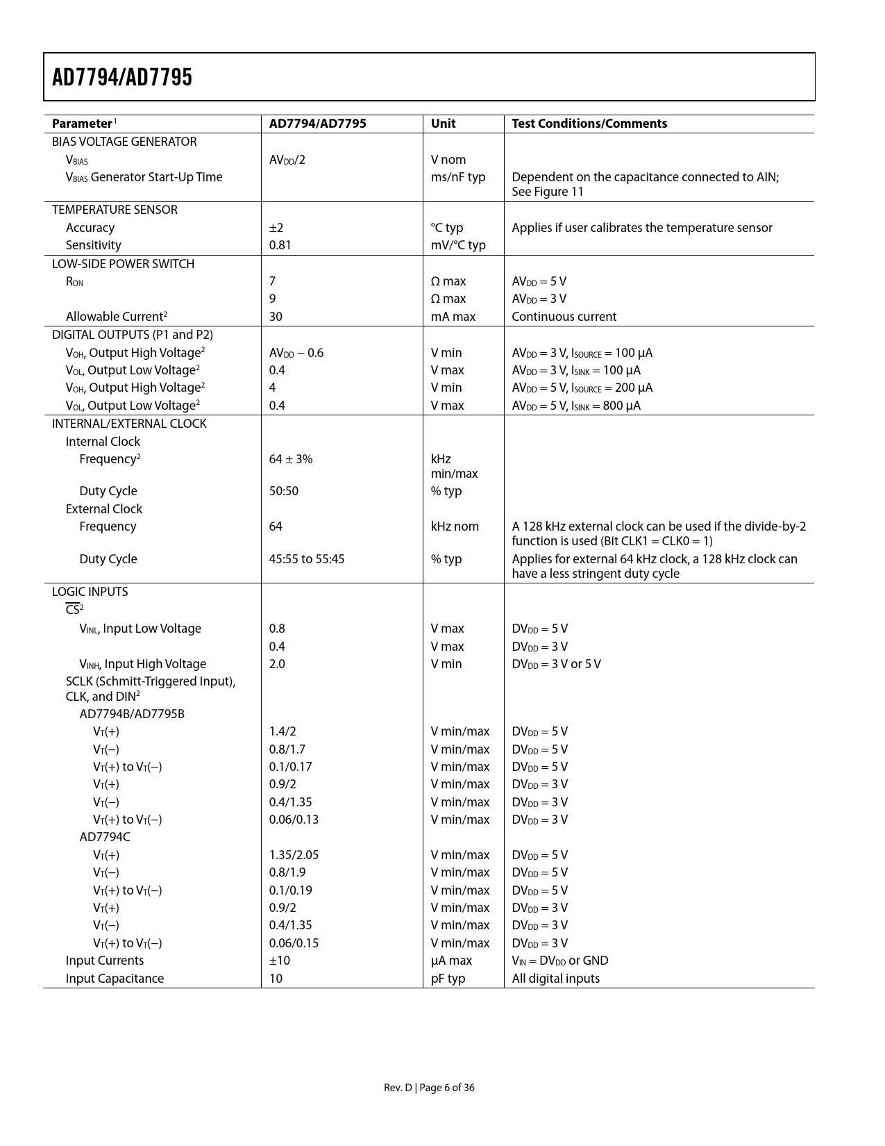 页数 / 页36 / 6 — AD7794/AD7795. Parameter. Unit. Test Conditions/Comments