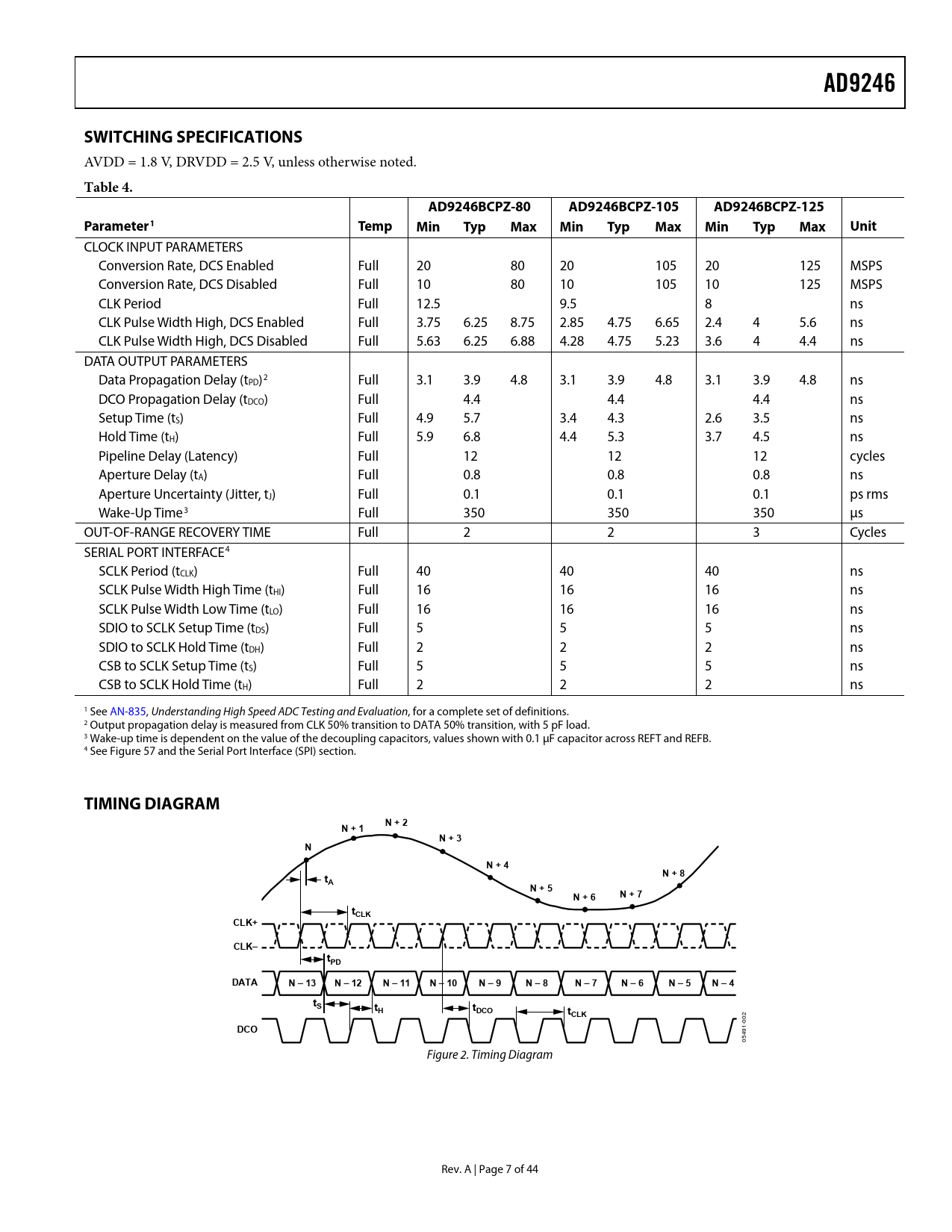 AD9246 SWITCHING SPECIFICATIONS Table 4 AD9246BCPZ-80 AD9246BCPZ-105 AD9246BCPZ-125 Parameter Temp