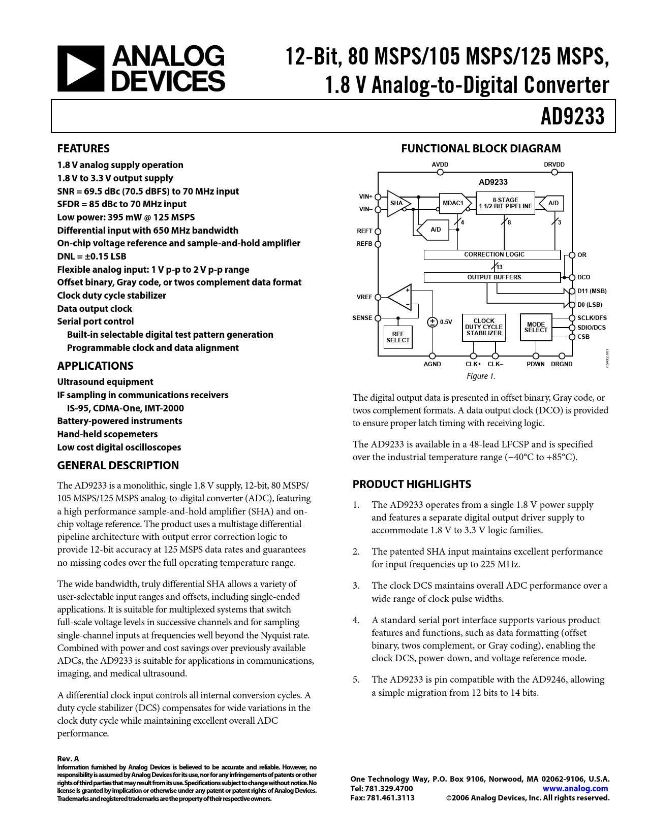 12-Bit, 80 MSPS/105 MSPS/125 MSPS,. 1.8 V Analog-to-Digital Converter. AD9233. FEATURES. FUNCTIONAL BLOCK DIAGRAM
