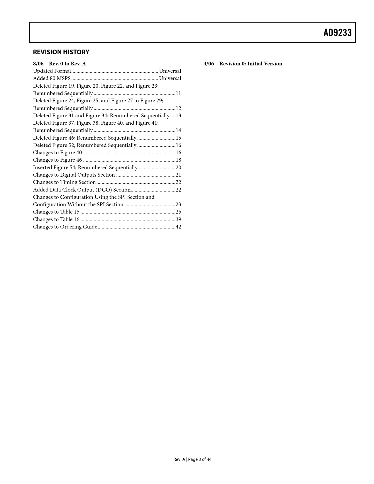 | 页数 / 页 | 45 / 4 — AD9233. REVISION HISTORY. 8/06—Rev. 0 to Rev. A. 4/06—Revision 0: Initial … |