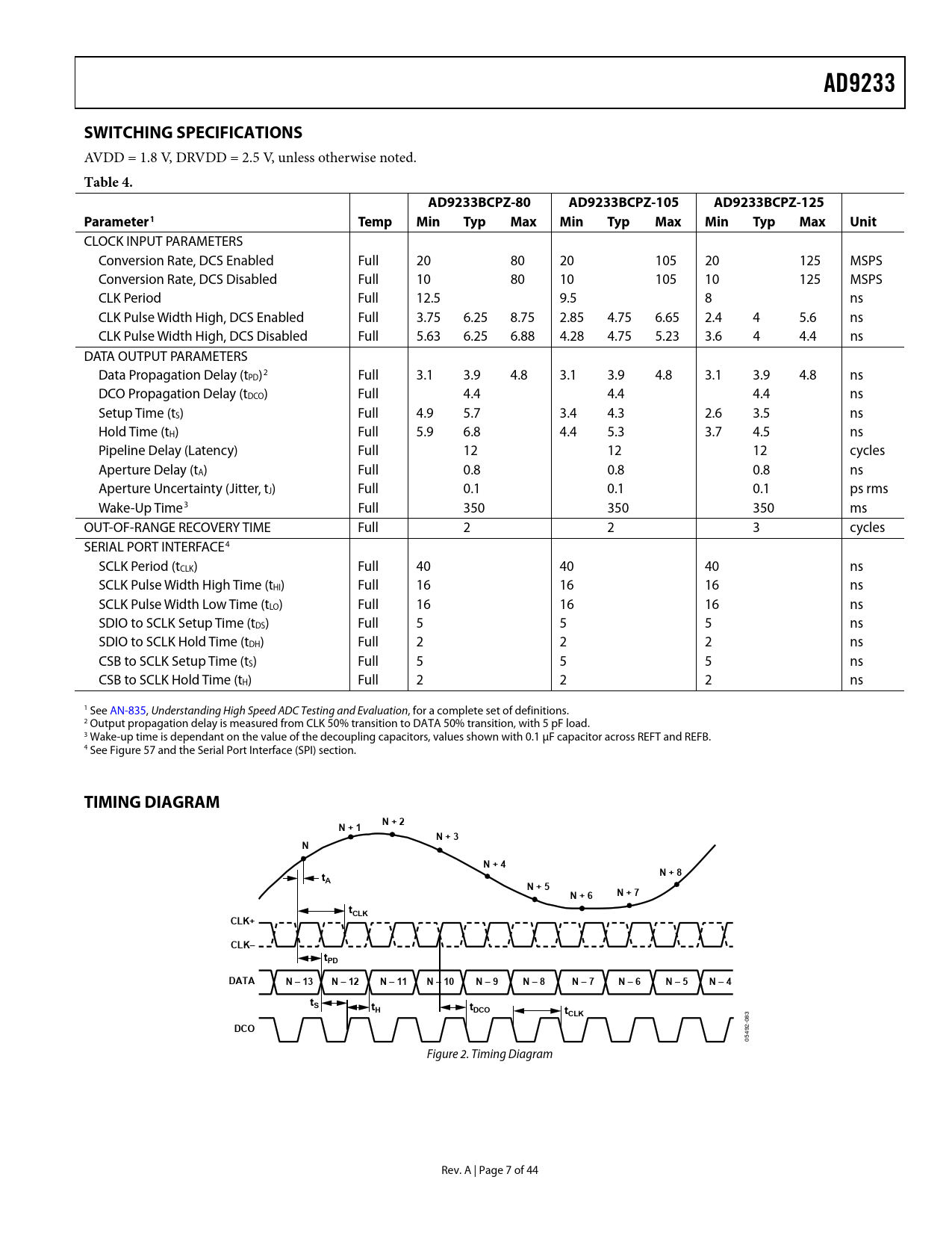 AD9233 SWITCHING SPECIFICATIONS Table 4 AD9233BCPZ-80 AD9233BCPZ-105 AD9233BCPZ-125 Parameter1 Temp