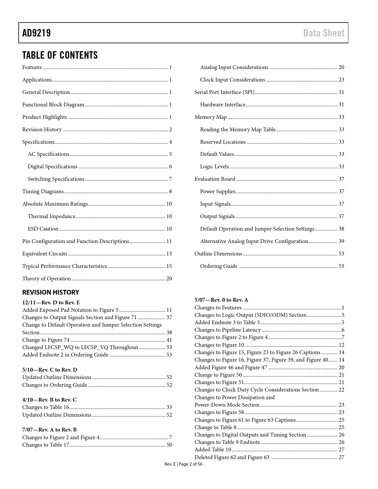 页数 / 页57 / 3 — AD9219. Data Sheet. TABLE OF CONTENTS. REVISION HISTORY. 12/11—Rev. D to …