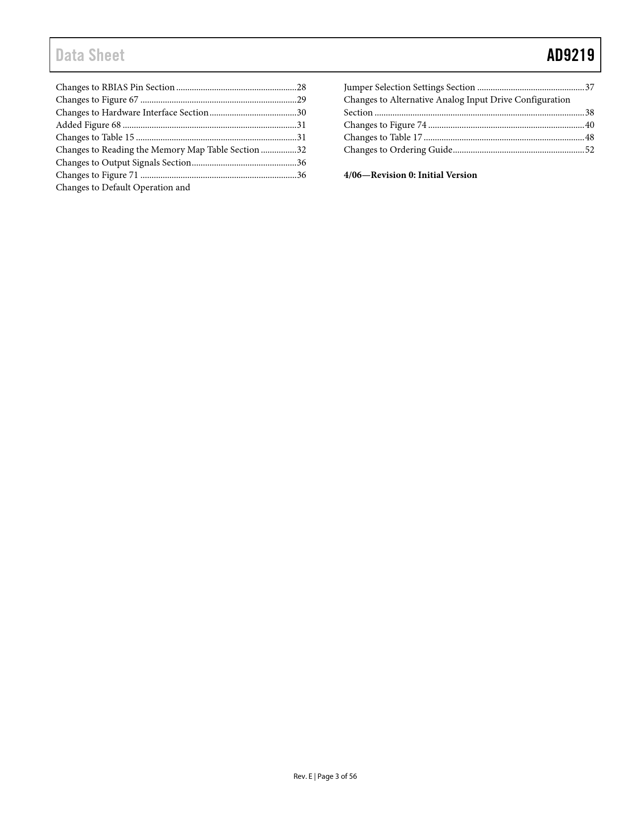 | 页数 / 页 | 57 / 4 — Data Sheet. AD9219. 4/06—Revision 0: Initial Version |
