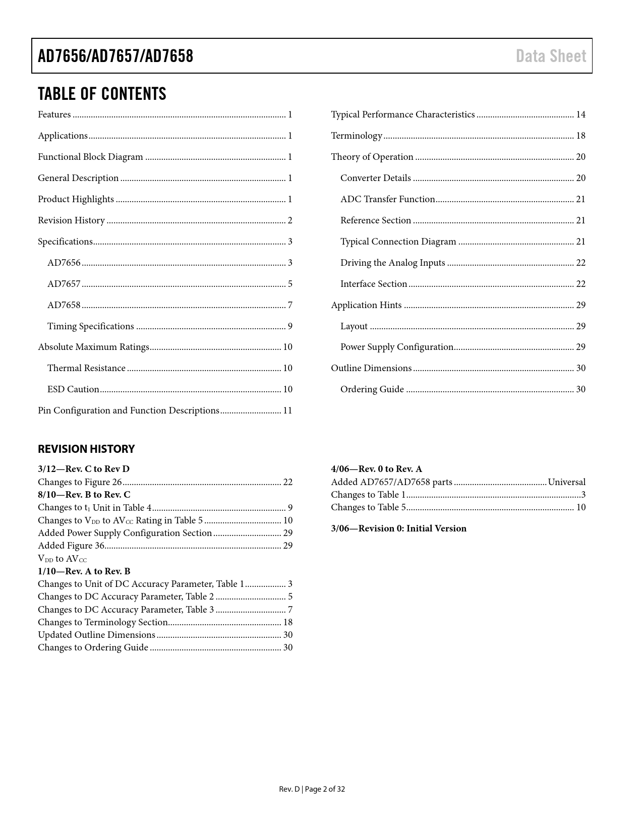 link to page 1 link to page 1 link to page 1 link to page 1 link to page 1 link to page 2 link to page 3 link to page 3 link to page 5 link to page 7 link to page 9 link to page 10 link to page 10 link to page 10 link to page 11 link to page 14 link to page 18 link to page 20 link to page 20 link to page 21 link to page 21 link to page 21 link to page 22 link to page 22 link to page 29 link to page 29 link to page 29 link to page 30 link to page 30 AD7656/AD7657/AD7658Data SheetTABLE OF CONTENTS Features .. 1 Typical Performance Characteristics ... 14 Applications ... 1 Terminology .. 18 Functional Block Diagram .. 1 Theory of Operation .. 20 General Description ... 1 Converter Details ... 20 Product Highlights ... 1 ADC Transfer Function ... 21 Revision History ... 2 Reference Section ... 21 Specifications ... 3 Typical Connection Diagram ... 21 AD7656 .. 3 Driving the Analog Inputs .. 22 AD7657 .. 5 Interface Section ... 22 AD7658 .. 7 Application Hints ... 29 Timing Specifications .. 9 Layout .. 29 Absolute Maximum Ratings .. 10 Power Supply Configuration... 29 Thermal Resistance .. 10 Outline Dimensions ... 30 ESD Caution .. 10 Ordering Guide .. 30 Pin Configuration and Function Descriptions ... 11 REVISION HISTORY3/12—Rev. C to Rev D4/06—Rev. 0 to Rev. A Changes to Figure 26 .. 22 Added AD7657/AD7658 parts ... Universal 8/10—Rev. B to Rev. C Changes to Table 1 ... 3 Changes to t1 Unit in Table 4 ... 9 Changes to Table 5 .. 10 Changes to VDD to AVCC Rating in Table 5 .. 10 Added Power Supply Configuration Section .. 29 3/06—Revision 0: Initial Version Added Figure 36 .. 29 VDD to AVCC 1/10—Rev. A to Rev. B Changes to Unit of DC Accuracy Parameter, Table 1 .. 3 Changes to DC Accuracy Parameter, Table 2 ... 5 Changes to DC Accuracy Parameter, Table 3 ... 7 Changes to Terminology Section.. 18 Updated Outline Dimensions ... 30 Changes to Ordering Guide .. 30 Rev. D | Page 2 of 32 Document Outline Features Applications Functional Block Diagram General Description Product Highlights Table of Contents Revision History Specifications AD7656 AD7657 AD7658 Timing Specifications Absolute Maximum Ratings Thermal Resistance ESD Caution Pin Configuration and Function Descriptions Typical Performance Characteristics Terminology Theory of Operation Converter Details Track-and-Hold Section Analog Input Section ADC Transfer Function Reference Section Typical Connection Diagram Driving the Analog Inputs Interface Section Parallel Interface (SER/ = 0) Software Selection of ADCs Changing the Analog Input Range (/S SEL = 0) Changing the Analog Input Range (/S SEL = 1) Serial Interface (SER/ = 1) Serial Read Operation Daisy-Chain Mode (DCEN = 1, SER/ = 1) Standby/Partial Power-Down Modes of Operation Application Hints Layout Power Supply Configuration Outline Dimensions Ordering Guide