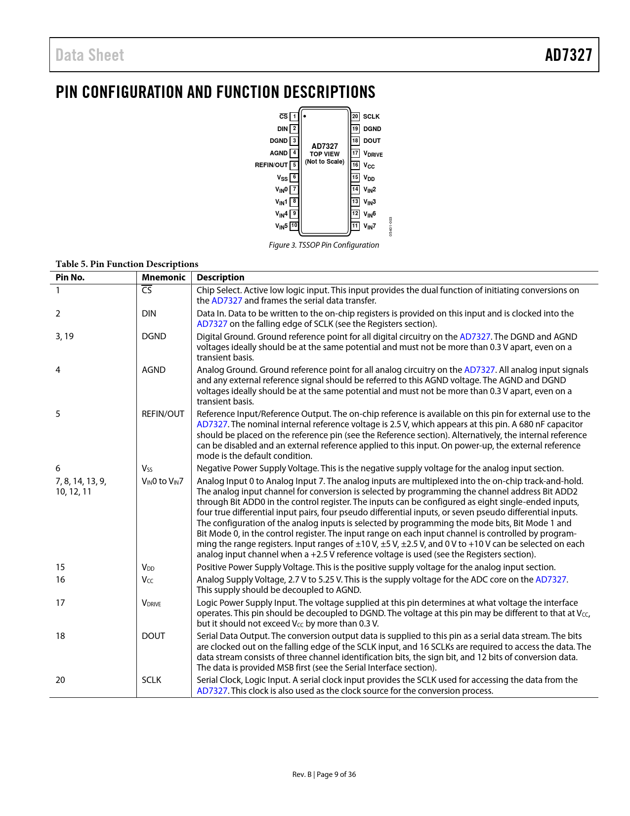 Data Sheet AD7327 PIN CONFIGURATION AND FUNCTION DESCRIPTIONS CS 1 SCLK DIN 2 DGND DGND 3 DOUT AGND 4 TOP VIEW VDRIVE