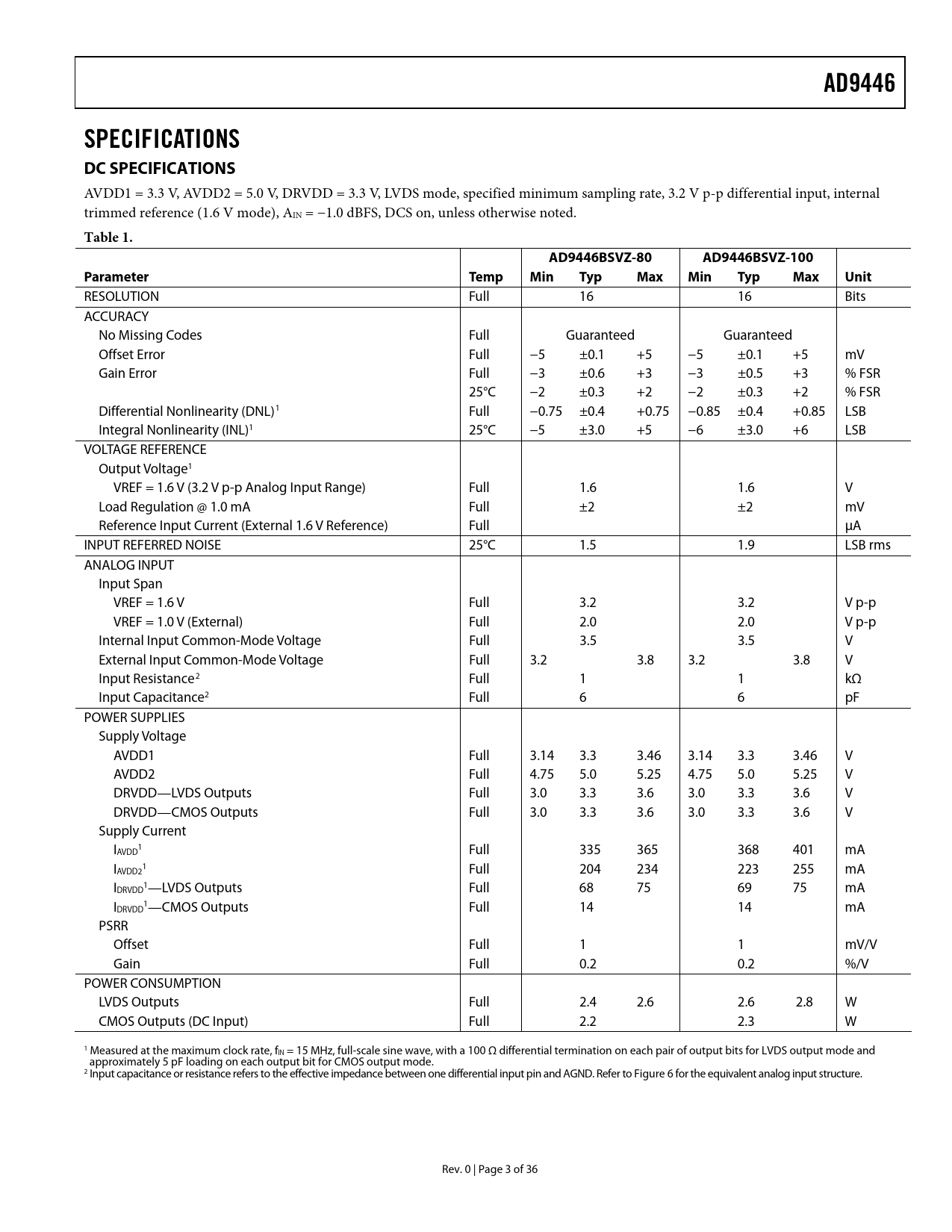 AD9446. SPECIFICATIONS DC SPECIFICATIONS. Table 1. AD9446BSVZ-80. AD9446BSVZ-100. Parameter. Temp. Min Typ Max Min Typ Max Unit