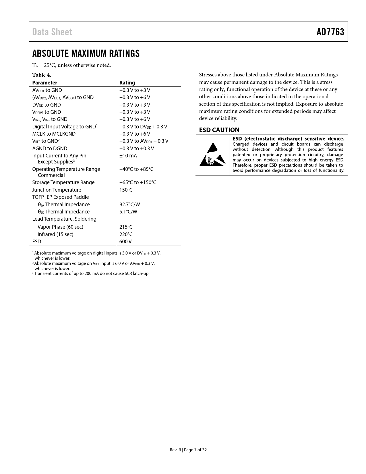 Data Sheet. AD7763. ABSOLUTE MAXIMUM RATINGS. Table 4. Parameter. Rating. ESD CAUTION