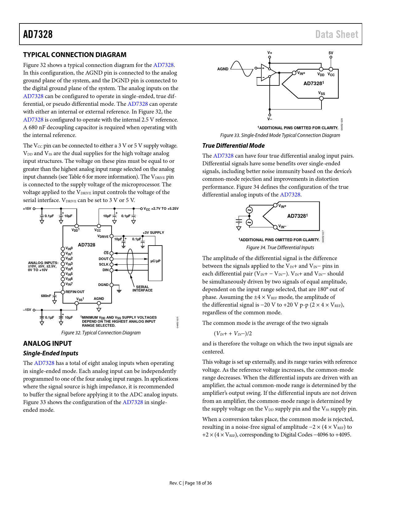link to page 16 link to page 19 link to page 19 link to page 19 link to page 19 AD7328Data SheetTYPICAL CONNECTION DIAGRAMV+5V Figure 32 shows a typical connection diagram for the AD7328. AGND In this configuration, the AGND pin is connected to the analog VIN+VDD VCC ground plane of the system, and the DGND pin is connected to AD73281 the digital ground plane of the system. The analog inputs on the V AD7328 can be configured to operate in single-ended, true dif- SS ferential, or pseudo differential mode. The AD7328 can operate with either an internal or external reference. In Figure 32, the AD7328 is configured to operate with the internal 2.5 V reference. V– 026 A 680 nF decoupling capacitor is required when operating with 1ADDITIONAL PINS OMITTED FOR CLARITY. 4852- 0 the internal reference. Figure 33. Single-Ended Mode Typical Connection Diagram The VCC pin can be connected to either a 3 V or 5 V supply voltage. True Differential Mode VDD and VSS are the dual supplies for the high voltage analog The AD7328 can have four true differential analog input pairs. input structures. The voltage on these pins must be equal to or Differential signals have some benefits over single-ended greater than the highest analog input range selected on the analog signals, including better noise immunity based on the device’s input channels (see Table 6 for more information). The VDRIVE pin common-mode rejection and improvements in distortion is connected to the supply voltage of the microprocessor. The performance. Figure 34 defines the configuration of the true voltage applied to the VDRIVE input controls the voltage of the differential analog inputs of the AD7328. serial interface. VDRIVE can be set to 3 V or 5 V. VIN++15VVCC +2.7V TO +5.25V++0.1µF10µF10µF0.1µFAD73281VIN–V1VDDCC+3V SUPPLY 027 VDRIVE10µF +0.1µF1ADDITIONAL PINS OMITTED FOR CLARITY. 04852- AD7328V Figure 34. True Differential Inputs IN0VIN1CSVIN2DOUT The amplitude of the differential signal is the difference µC/µPANALOG INPUTS:VIN3SCLK±10V, ±5V, ±2.5V, between the signals applied to the V V IN+ and VIN− pins in IN40V TO +10VDINVIN5 each differential pair (VIN+ − VIN−). VIN+ and VIN− should VIN6 be simultaneously driven by two signals of equal amplitude, VIN7DGNDSERIALINTERFACE dependent on the input range selected, that are 180° out of REFIN/OUT680nF phase. Assuming the ±4 × V V1AGND REF mode, the amplitude of SS the differential signal is −20 V to +20 V p-p (2 × 4 × VREF), –15V+ regardless of the common mode. 0.1µF10µF1MINIMUM VDD AND VSS SUPPLY VOLTAGES 25 DEPEND ON THE HIGHEST ANALOG INPUT 0 52- The common mode is the average of the two signals RANGE SELECTED. 48 0 Figure 32. Typical Connection Diagram (VIN+ + VIN−)/2 ANALOG INPUT and is therefore the voltage on which the two input signals are Single-Ended Inputs centered. The AD7328 has a total of eight analog inputs when operating This voltage is set up externally, and its range varies with reference in single-ended mode. Each analog input can be independently voltage. As the reference voltage increases, the common-mode programmed to one of the four analog input ranges. In applications range decreases. When the differential inputs are driven with an where the signal source is high impedance, it is recommended amplifier, the actual common-mode range is determined by the to buffer the signal before applying it to the ADC analog inputs. amplifier’s output swing. If the differential inputs are not driven Figure 33 shows the configuration of the AD7328 in single- from an amplifier, the common-mode range is determined by ended mode. the supply voltage on the VDD supply pin and the VSS supply pin. When a conversion takes place, the common mode is rejected, resulting in a noise-free signal of amplitude −2 × (4 × VREF) to +2 × (4 × VREF), corresponding to Digital Codes −4096 to +4095. Rev. C | Page 18 of 36 Document Outline Features General Description Functional Block Diagram Product Highlights Table of Contents Revision History Specifications Timing Specifications Absolute Maximum Ratings ESD Caution Pin Configuration and Function Descriptions Typical Performance Characteristics Terminology Theory of Operation Circuit Information Converter Operation Output Coding Transfer Functions Analog Input Structure Track-and-Hold Section Typical Connection Diagram Analog Input Single-Ended Inputs True Differential Mode Pseudo Differential Inputs Driver Amplifier Choice Registers Addressing Registers Control Register Sequence Register Range Registers Sequencer Operation Reference VDRIVE Temperature Indicator Modes of Operation Normal Mode (PM1 = PM0 = 0) Full Shutdown Mode (PM1 = PM0 = 1) Autoshutdown Mode (PM1 = 1, PM0 = 0) Autostandby Mode (PM1 = 0, PM0 = 1) Power vs. Throughput Rate Serial Interface Microprocessor Interfacing AD7328 to ADSP-21xx AD7328 to ADSP-BF53x Applications Information Layout and Grounding Power Supply Configuration Outline Dimensions Ordering Guide