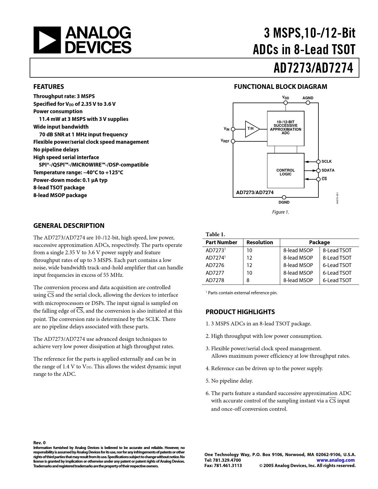 point. The conversion rate is determined by the SCLK. There 1. 3 MSPS ADCs in an 8-lead TSOT package. are no pipeline delays associated with these parts. 2. High throughput with low power consumption. The AD7273/AD7274 use advanced design techniques to achieve very low power dissipation at high throughput rates. 3. Flexible power/serial clock speed management. Allows maximum power efficiency at low throughput rates. The reference for the parts is applied externally and can be in the range of 1.4 V to VDD. This allows the widest dynamic input 4. Reference can be driven up to the power supply. range to the ADC. 5. No pipeline delay. 6. The parts feature a standard successive approximation ADC with accurate control of the sampling instant via a CS input and once-off conversion control.