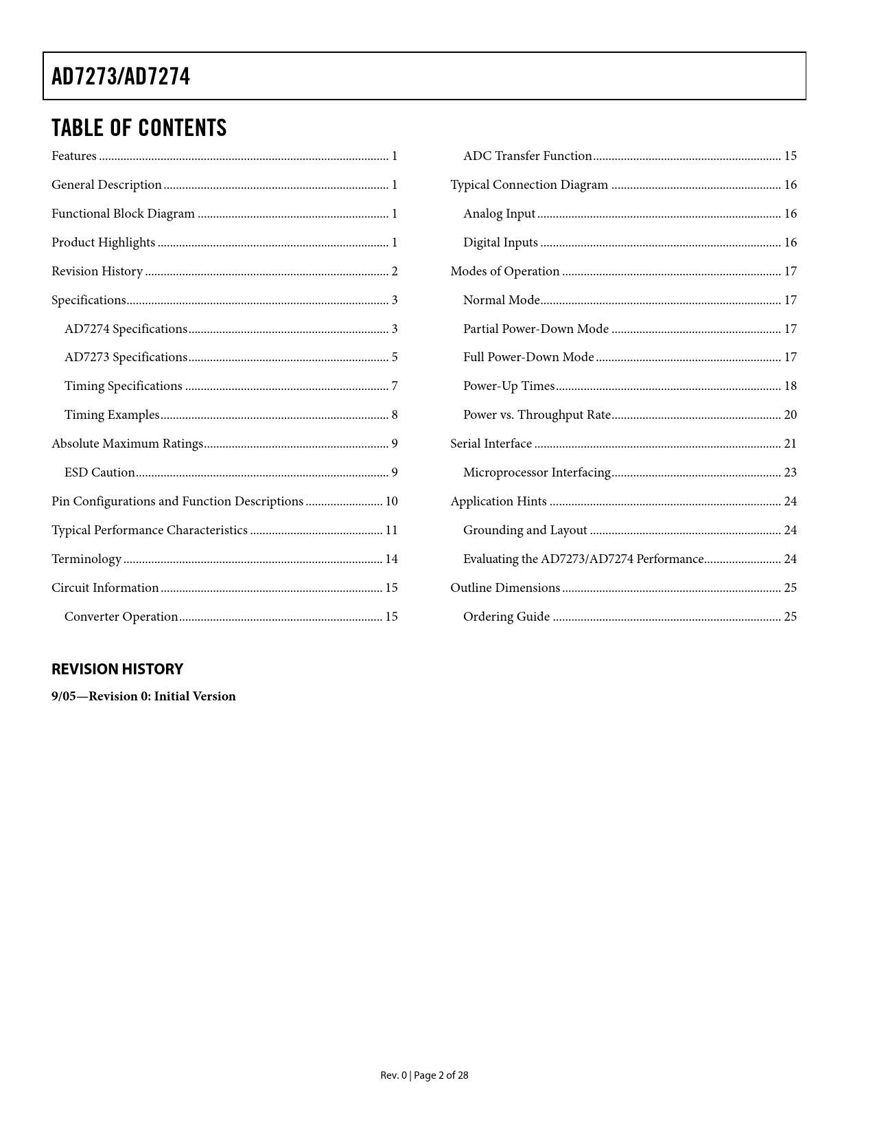 页数 / 页28 / 2 — AD7273/AD7274. TABLE OF CONTENTS. REVISION HISTORY. 9/05—Revision 0: …