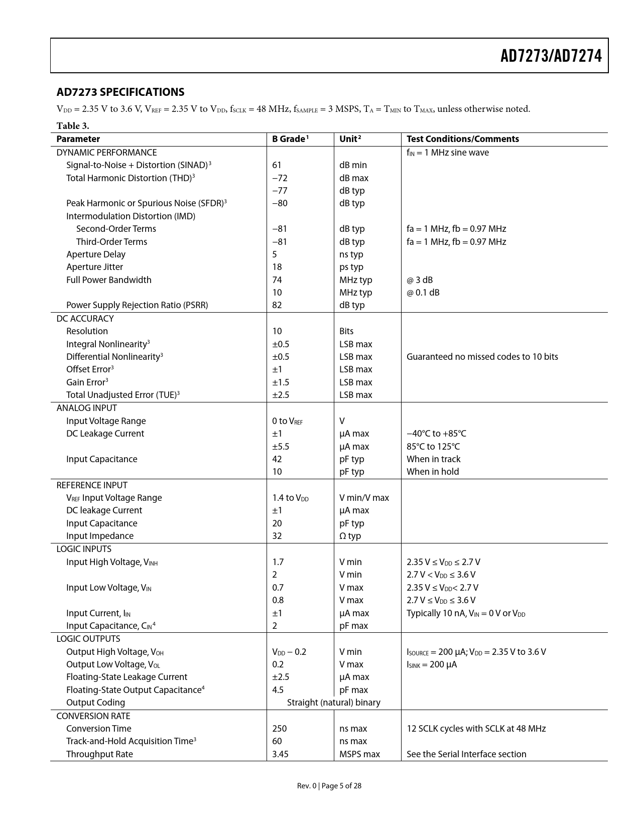 link to page 6 link to page 6 link to page 6 link to page 6 link to page 6 link to page 6 link to page 6 link to page 6 link to page 6 link to page 6 link to page 6 link to page 6 link to page 6 link to page 21 AD7273/AD7274AD7273 SPECIFICATIONS VDD = 2.35 V to 3.6 V, VREF = 2.35 V to VDD, fSCLK = 48 MHz, fSAMPLE = 3 MSPS, TA = TMIN to TMAX, unless otherwise noted. Table 3. Parameter BGrade1Unit2Test Conditions/Comments DYNAMIC PERFORMANCE fIN = 1 MHz sine wave Signal-to-Noise + Distortion (SINAD)3 61 dB min Total Harmonic Distortion (THD)3 −72 dB max −77 dB typ Peak Harmonic or Spurious Noise (SFDR)3 −80 dB typ Intermodulation Distortion (IMD) Second-Order Terms −81 dB typ fa = 1 MHz, fb = 0.97 MHz Third-Order Terms −81 dB typ fa = 1 MHz, fb = 0.97 MHz Aperture Delay 5 ns typ Aperture Jitter 18 ps typ Full Power Bandwidth 74 MHz typ @ 3 dB 10 MHz typ @ 0.1 dB Power Supply Rejection Ratio (PSRR) 82 dB typ DC ACCURACY Resolution 10 Bits Integral Nonlinearity3 ±0.5 LSB max Differential Nonlinearity3 ±0.5 LSB max Guaranteed no missed codes to 10 bits Offset Error3 ±1 LSB max Gain Error3 ±1.5 LSB max Total Unadjusted Error (TUE)3 ±2.5 LSB max ANALOG INPUT Input Voltage Range 0 to VREF V DC Leakage Current ±1 μA max −40°C to +85°C ±5.5 μA max 85°C to 125°C Input Capacitance 42 pF typ When in track 10 pF typ When in hold REFERENCE INPUT VREF Input Voltage Range 1.4 to VDD V min/V max DC leakage Current ±1 μA max Input Capacitance 20 pF typ Input Impedance 32 Ω typ LOGIC INPUTS Input High Voltage, VINH 1.7 V min 2.35 V ≤ VDD ≤ 2.7 V 2 V min 2.7 V < VDD ≤ 3.6 V Input Low Voltage, VIN 0.7 V max 2.35 V ≤ VDD< 2.7 V 0.8 V max 2.7 V ≤ VDD ≤ 3.6 V Input Current, IIN ±1 μA max Typically 10 nA, VIN = 0 V or VDD Input Capacitance, C 4 IN 2 pF max LOGIC OUTPUTS Output High Voltage, VOH VDD − 0.2 V min ISOURCE = 200 μA; VDD = 2.35 V to 3.6 V Output Low Voltage, VOL 0.2 V max ISINK = 200 μA Floating-State Leakage Current ±2.5 μA max Floating-State Output Capacitance4 4.5 pF max Output Coding Straight (natural) binary CONVERSION RATE Conversion Time 250 ns max 12 SCLK cycles with SCLK at 48 MHz Track-and-Hold Acquisition Time3 60 ns max Throughput Rate 3.45 MSPS max See the Serial Interface section Rev. 0 | Page 5 of 28 Document Outline FEATURES GENERAL DESCRIPTION FUNCTIONAL BLOCK DIAGRAM PRODUCT HIGHLIGHTS REVISION HISTORY SPECIFICATIONS AD7274 SPECIFICATIONS AD7273 SPECIFICATIONS TIMING SPECIFICATIONS TIMING EXAMPLES Timing Example 1 Timing Example 2 ABSOLUTE MAXIMUM RATINGS ESD CAUTION PIN CONFIGURATIONS AND FUNCTION DESCRIPTIONS TYPICAL PERFORMANCE CHARACTERISTICS TERMINOLOGY CIRCUIT INFORMATION CONVERTER OPERATION ADC TRANSFER FUNCTION TYPICAL CONNECTION DIAGRAM ANALOG INPUT DIGITAL INPUTS MODES OF OPERATION NORMAL MODE PARTIAL POWER-DOWN MODE FULL POWER-DOWN MODE POWER-UP TIMES POWER VS. THROUGHPUT RATE SERIAL INTERFACE MICROPROCESSOR INTERFACING AD7273/AD7274 to ADSP-BF53x APPLICATION HINTS GROUNDING AND LAYOUT EVALUATING THE AD7273/AD7274 PERFORMANCE OUTLINE DIMENSIONS ORDERING GUIDE