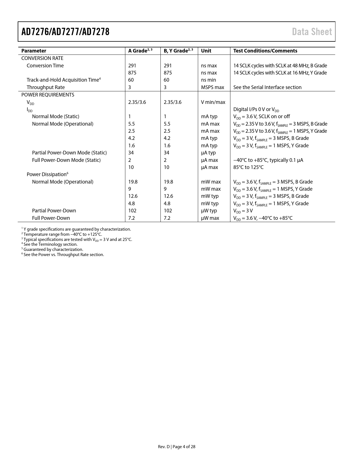 页数 / 页28 / 4 — AD7276/AD7277/AD7278. Data Sheet. Parameter. A Grade2, 3. B, Y Grade2, 3. …