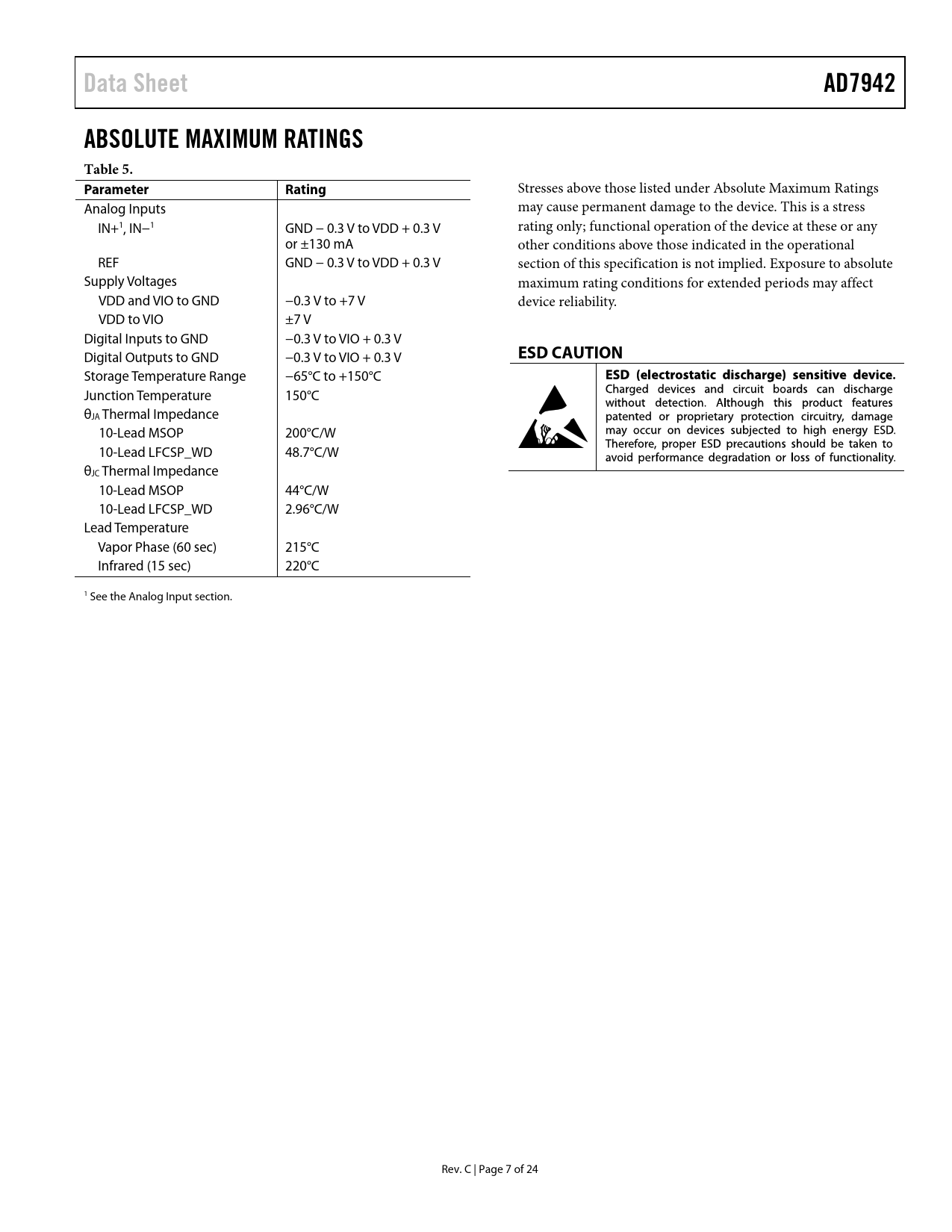 Data Sheet AD7942 ABSOLUTE MAXIMUM RATINGS Table 5 Parameter Rating ESD CAUTION