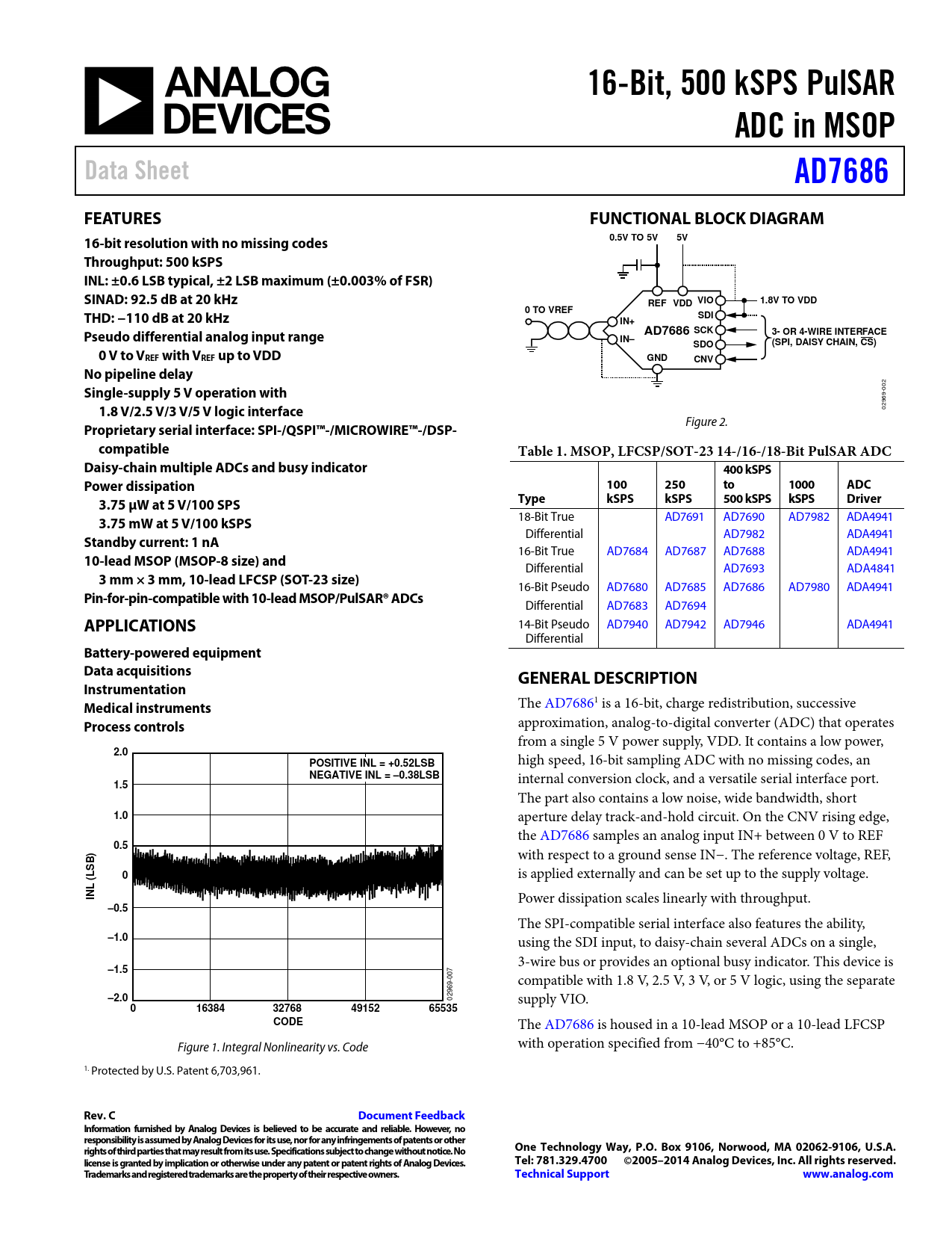 The AD7686 is housed in a 10-lead MSOP or a 10-lead LFCSP Figure 1. Integral Nonlinearity vs. Code with operation specified from −40°C to +85°C. 1. Protected by U.S. Patent 6,703,961.