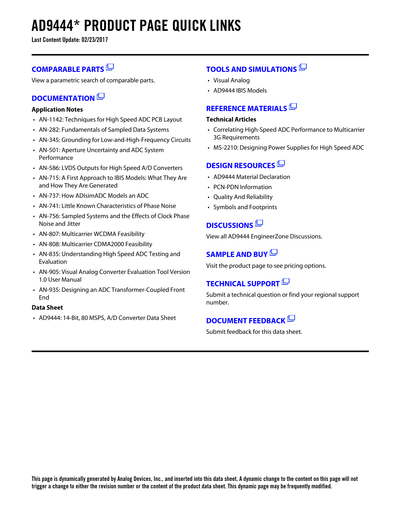 AD9444* PRODUCT PAGE QUICK LINKS Last Content Update: 02/23/2017COMPARABLE PARTSTOOLS AND SIMULATIONS View a parametric search of comparable parts. • Visual Analog • AD9444 IBIS Models DOCUMENTATIONApplication NotesREFERENCE MATERIALS • AN-1142: Techniques for High Speed ADC PCB Layout Technical Articles • AN-282: Fundamentals of Sampled Data Systems • Correlating High-Speed ADC Performance to Multicarrier • AN-345: Grounding for Low-and-High-Frequency Circuits 3G Requirements • AN-501: Aperture Uncertainty and ADC System • MS-2210: Designing Power Supplies for High Speed ADC Performance • AN-586: LVDS Outputs for High Speed A/D Converters DESIGN RESOURCES • AN-715: A First Approach to IBIS Models: What They Are • AD9444 Material Declaration and How They Are Generated • PCN-PDN Information • AN-737: How ADIsimADC Models an ADC • Quality And Reliability • AN-741: Little Known Characteristics of Phase Noise • Symbols and Footprints • AN-756: Sampled Systems and the Effects of Clock Phase Noise and Jitter DISCUSSIONS • AN-807: Multicarrier WCDMA Feasibility View all AD9444 EngineerZone Discussions. • AN-808: Multicarrier CDMA2000 Feasibility • AN-835: Understanding High Speed ADC Testing and SAMPLE AND BUY Evaluation Visit the product page to see pricing options. • AN-905: Visual Analog Converter Evaluation Tool Version 1.0 User Manual TECHNICAL SUPPORT • AN-935: Designing an ADC Transformer-Coupled Front End Submit a technical question or find your regional support number. Data Sheet • AD9444: 14-Bit, 80 MSPS, A/D Converter Data Sheet DOCUMENT FEEDBACK Submit feedback for this data sheet. This page is dynamically generated by Analog Devices, Inc., and inserted into this data sheet. A dynamic change to the content on this page will not trigger a change to either the revision number or the content of the product data sheet. This dynamic page may be frequently modified. Document Outline FEATURES APPLICATIONS GENERAL DESCRIPTION FUNCTIONAL BLOCK DIAGRAM PRODUCT HIGHLIGHTS TABLE OF CONTENTS DC SPECIFICATIONS AC SPECIFICATIONS DIGITAL SPECIFICATIONS SWITCHING SPECIFICATIONS EXPLANATION OF TEST LEVELS ABSOLUTE MAXIMUM RATINGS Thermal Resistance ESD CAUTION DEFINITIONS OF SPECIFICATIONS PIN CONFIGURATIONS AND FUNCTION DESCRIPTIONS EQUIVALENT CIRCUITS TYPICAL PERFORMANCE CHARACTERISTICS THEORY OF OPERATION ANALOG INPUT AND REFERENCE OVERVIEW Internal Reference Connection Internal Reference Trim External Reference Operation Analog Inputs CLOCK INPUT CONSIDERATIONS Jitter Considerations POWER CONSIDERATIONS DIGITAL OUTPUTS LVDS Mode CMOS Mode TIMING OPERATIONAL MODE SELECTION Data Format Select Output Mode Select Duty Cycle Stabilizer EVALUATION BOARD LVDS EVALUATION BOARD SCHEMATICS LVDS MODE EVALUATION BOARD BILL OF MATERIALS (BOM) CMOS EVALUATION BOARD SCHEMATICS CMOS MODE EVALUATION BOARD BILL OF MATERIALS (BOM) OUTLINE DIMENSIONS ORDERING GUIDE