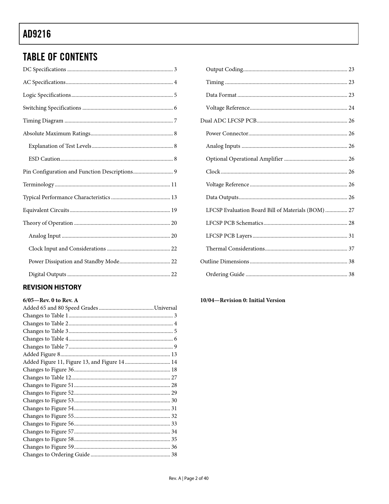 link to page 4 link to page 5 link to page 6 link to page 7 link to page 8 link to page 9 link to page 9 link to page 9 link to page 10 link to page 12 link to page 14 link to page 20 link to page 21 link to page 21 link to page 23 link to page 23 link to page 23 link to page 24 link to page 24 link to page 24 link to page 25 link to page 27 link to page 27 link to page 27 link to page 27 link to page 27 link to page 27 link to page 27 link to page 28 link to page 29 link to page 32 link to page 38 link to page 39 link to page 39 AD9216 TABLE OF CONTENTS DC Specifications ... 3 Output Coding.. 23 AC Specifications.. 4 Timing ... 23 Logic Specifications.. 5 Data Format .. 23 Switching Specifications .. 6 Voltage Reference... 24 Timing Diagram ... 7 Dual ADC LFCSP PCB.. 26 Absolute Maximum Ratings.. 8 Power Connector.. 26 Explanation of Test Levels ... 8 Analog Inputs ... 26 ESD Caution.. 8 Optional Operational Amplifier .. 26 Pin Configuration and Function Descriptions... 9 Clock .. 26 Terminology .. 11 Voltage Reference ... 26 Typical Performance Characteristics ... 13 Data Outputs... 26 Equivalent Circuits ... 19 LFCSP Evaluation Board Bill of Materials (BOM) .. 27 Theory of Operation .. 20 LFCSP PCB Schematics... 28 Analog Input ... 20 LFCSP PCB Layers ... 31 Clock Input and Considerations .. 22 Thermal Considerations.. 37 Power Dissipation and Standby Mode... 22 Outline Dimensions ... 38 Digital Outputs ... 22 Ordering Guide .. 38