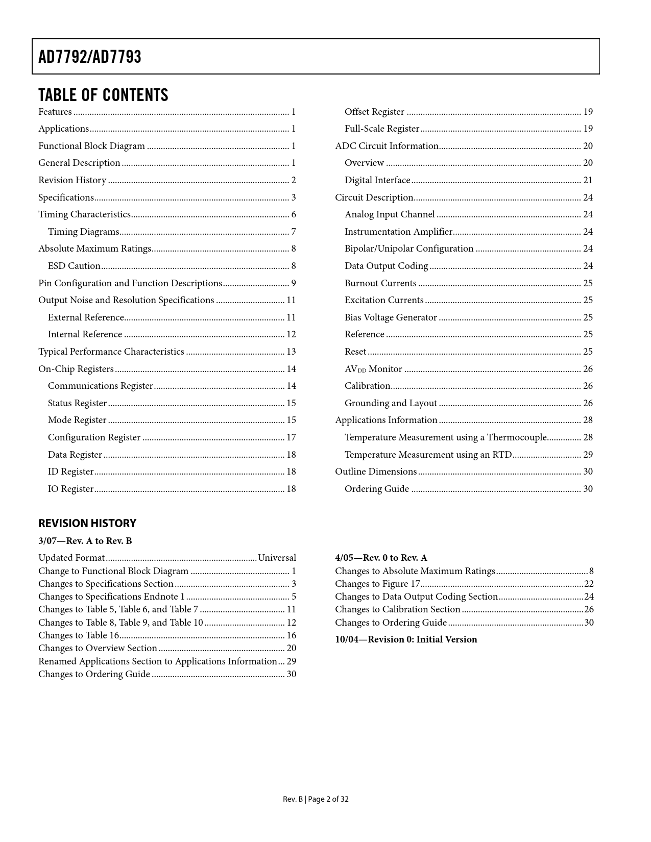 页数 / 页32 / 2 — AD7792/AD7793. TABLE OF CONTENTS. REVISION HISTORY. 3/07—Rev. A to Rev. …
