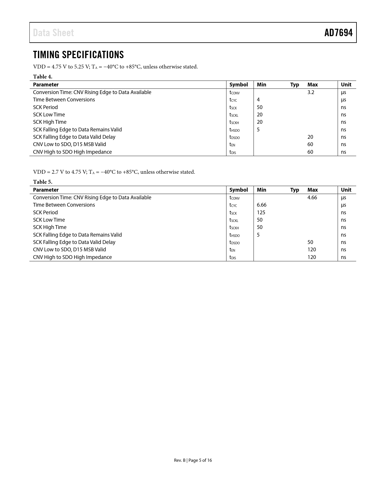 Data Sheet AD7694 TIMING SPECIFICATIONS Table 4 Parameter Symbol Min Typ Max Unit Table 5 Parameter