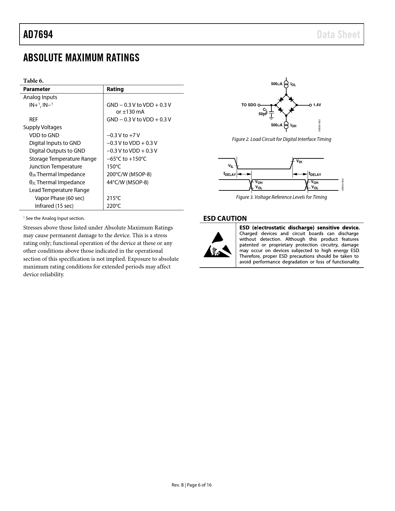 link to page 14 link to page 7 link to page 7 AD7694Data SheetABSOLUTE MAXIMUM RATINGSTable 6.500 µ AIOLParameterRating Analog Inputs IN+1, IN−1 GND − 0.3 V to VDD + 0.3 V TO SDO1.4V or ±130 mA CL50pF REF GND − 0.3 V to VDD + 0.3 V Supply Voltages 500 µ AIOH 05003-002 VDD to GND −0.3 V to +7 V Figure 2. Load Circuit for Digital Interface Timing Digital Inputs to GND −0.3 V to VDD + 0.3 V Digital Outputs to GND −0.3 V to VDD + 0.3 V Storage Temperature Range −65°C to +150°C VIH Junction Temperature 150°C VIL θJA Thermal Impedance 200°C/W (MSOP-8) tDELAYtDELAY θJC Thermal Impedance 44°C/W (MSOP-8) VVOHOH Lead Temperature Range VVOLOL 05003-003 Vapor Phase (60 sec) 215°C Figure 3. Voltage Reference Levels for Timing Infrared (15 sec) 220°C 1 See the Analog Input section. ESD CAUTION Stresses above those listed under Absolute Maximum Ratings may cause permanent damage to the device. This is a stress rating only; functional operation of the device at these or any other conditions above those indicated in the operational section of this specification is not implied. Exposure to absolute maximum rating conditions for extended periods may affect device reliability. Rev. B | Page 6 of 16 Document Outline Features Applications General Description Application Diagram Table of Contents Revision History Specifications Timing Specifications Absolute Maximum Ratings ESD Caution Pin Configuration and Function Descriptions Terminology Typical Performance Characteristics Application Information Circuit Information Converter Operation Transfer Functions Typical Connection Diagram Analog Input Driver Amplifier Choice Voltage Reference Input Power Supply Supplying the ADC from the Reference Digital Interface Layout Evaluating the AD7694 Performance Outline Dimensions Ordering Guide