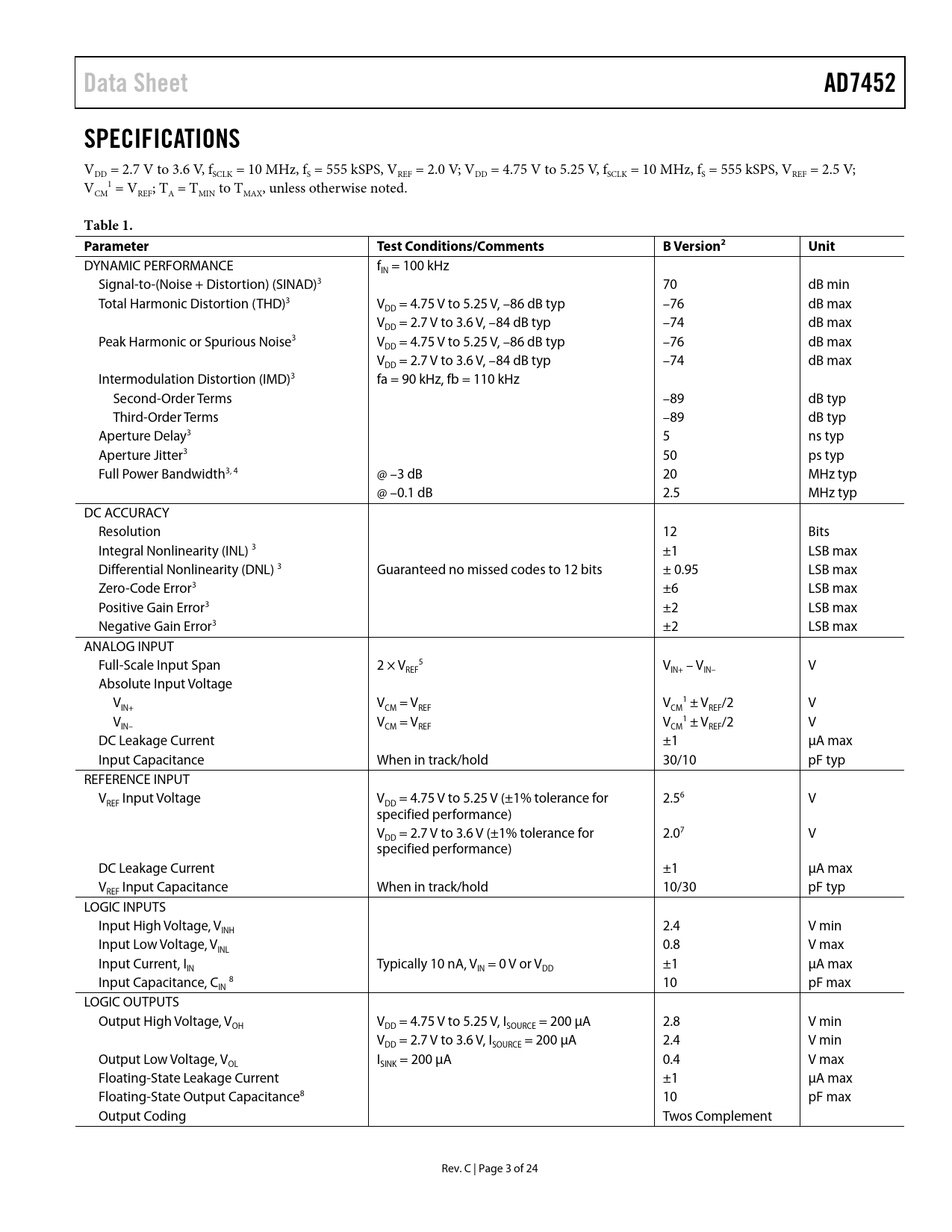 link to page 4 link to page 4 link to page 5 link to page 5 link to page 5 link to page 5 link to page 5 link to page 5 link to page 5 link to page 5 link to page 5 link to page 5 link to page 5 link to page 5 link to page 5 link to page 5 link to page 5 Data SheetAD7452SPECIFICATIONS VDD = 2.7 V to 3.6 V, fSCLK = 10 MHz, fS = 555 kSPS, VREF = 2.0 V; VDD = 4.75 V to 5.25 V, fSCLK = 10 MHz, fS = 555 kSPS, VREF = 2.5 V; V 1 CM = VREF; TA = TMIN to TMAX, unless otherwise noted. Table 1. ParameterTest Conditions/CommentsB Version2Unit DYNAMIC PERFORMANCE f = 100 kHz IN Signal-to-(Noise + Distortion) (SINAD)3 70 dB min Total Harmonic Distortion (THD)3 V = 4.75 V to 5.25 V, –86 dB typ –76 dB max DD V = 2.7 V to 3.6 V, –84 dB typ –74 dB max DD Peak Harmonic or Spurious Noise3 V = 4.75 V to 5.25 V, –86 dB typ –76 dB max DD V = 2.7 V to 3.6 V, –84 dB typ –74 dB max DD Intermodulation Distortion (IMD)3 fa = 90 kHz, fb = 110 kHz Second-Order Terms –89 dB typ Third-Order Terms –89 dB typ Aperture Delay3 5 ns typ Aperture Jitter3 50 ps typ Full Power Bandwidth3, 4 @ –3 dB 20 MHz typ @ –0.1 dB 2.5 MHz typ DC ACCURACY Resolution 12 Bits Integral Nonlinearity (INL) 3 ±1 LSB max Differential Nonlinearity (DNL) 3 Guaranteed no missed codes to 12 bits ± 0.95 LSB max Zero-Code Error3 ±6 LSB max Positive Gain Error3 ±2 LSB max Negative Gain Error3 ±2 LSB max ANALOG INPUT Full-Scale Input Span 2 × V 5 V – V V REF IN+ IN– Absolute Input Voltage V V = V V 1 ± V /2 V IN+ CM REF CM REF V V = V V 1 ± V /2 V IN– CM REF CM REF DC Leakage Current ±1 µA max Input Capacitance When in track/hold 30/10 pF typ REFERENCE INPUT V Input Voltage V = 4.75 V to 5.25 V (±1% tolerance for 2.56 V REF DD specified performance) V = 2.7 V to 3.6 V (±1% tolerance for 2.07 V DD specified performance) DC Leakage Current ±1 µA max V Input Capacitance When in track/hold 10/30 pF typ REF LOGIC INPUTS Input High Voltage, V 2.4 V min INH Input Low Voltage, V 0.8 V max INL Input Current, I Typically 10 nA, V = 0 V or V ±1 µA max IN IN DD Input Capacitance, C 8 10 pF max IN LOGIC OUTPUTS Output High Voltage, V V = 4.75 V to 5.25 V, I = 200 µA 2.8 V min OH DD SOURCE V = 2.7 V to 3.6 V, I = 200 µA 2.4 V min DD SOURCE Output Low Voltage, V I = 200 µA 0.4 V max OL SINK Floating-State Leakage Current ±1 µA max Floating-State Output Capacitance8 10 pF max Output Coding Twos Complement Rev. C | Page 3 of 24 Document Outline FEATURES APPLICATIONS GENERAL DESCRIPTION FUNCTIONAL BLOCK DIAGRAM PRODUCT HIGHLIGHTS TABLE OF CONTENTS REVISION HISTORY SPECIFICATIONS TIMING SPECIFICATIONS ABSOLUTE MAXIMUM RATINGS ESD CAUTION PIN CONFIGURATION AND FUNCTION DESCRIPTIONS TERMINOLOGY TYPICAL PERFORMANCE CHARACTERISTICS CIRCUIT INFORMATION CONVERTER OPERATION ADC TRANSFER FUNCTION TYPICAL CONNECTION DIAGRAM ANALOG INPUT Analog Input Structure DRIVING DIFFERENTIAL INPUTS Differential Amplifier Op Amp Pair RF Transformer DIGITAL INPUTS REFERENCE Example 1 Example 2 SINGLE-ENDED OPERATION SERIAL INTERFACE Timing Example MODES OF OPERATION NORMAL MODE POWER-DOWN MODE POWER-UP TIME POWER vs. THROUGHPUT RATE APPLICATION HINTS Grounding and Layout EVALUATING THE AD7452’S PERFORMANCE OUTLINE DIMENSIONS ORDERING GUIDE
