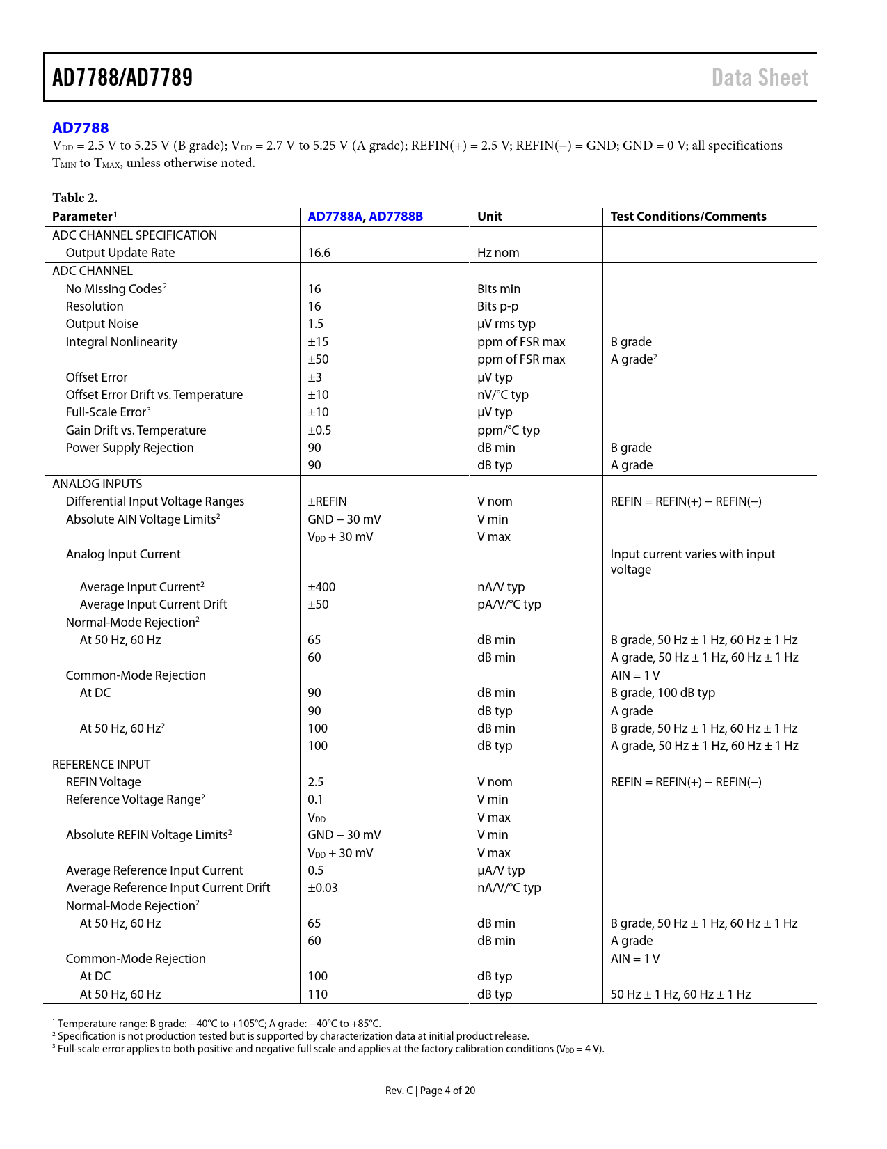AD7788/AD7789Data SheetAD7788 VDD = 2.5 V to 5.25 V (B grade); VDD = 2.7 V to 5.25 V (A grade); REFIN(+) = 2.5 V; REFIN(−) = GND; GND = 0 V; all specifications TMIN to TMAX, unless otherwise noted. Table 2. Parameter1AD7788A, AD7788BUnitTest Conditions/Comments ADC CHANNEL SPECIFICATION Output Update Rate 16.6 Hz nom ADC CHANNEL No Missing Codes2 16 Bits min Resolution 16 Bits p-p Output Noise 1.5 µV rms typ Integral Nonlinearity ±15 ppm of FSR max B grade ±50 ppm of FSR max A grade2 Offset Error ±3 µV typ Offset Error Drift vs. Temperature ±10 nV/°C typ Full-Scale Error3 ±10 µV typ Gain Drift vs. Temperature ±0.5 ppm/°C typ Power Supply Rejection 90 dB min B grade 90 dB typ A grade ANALOG INPUTS Differential Input Voltage Ranges ±REFIN V nom REFIN = REFIN(+) − REFIN(−) Absolute AIN Voltage Limits2 GND − 30 mV V min VDD + 30 mV V max Analog Input Current Input current varies with input voltage Average Input Current2 ±400 nA/V typ Average Input Current Drift ±50 pA/V/°C typ Normal-Mode Rejection2 At 50 Hz, 60 Hz 65 dB min B grade, 50 Hz ± 1 Hz, 60 Hz ± 1 Hz 60 dB min A grade, 50 Hz ± 1 Hz, 60 Hz ± 1 Hz Common-Mode Rejection AIN = 1 V At DC 90 dB min B grade, 100 dB typ 90 dB typ A grade At 50 Hz, 60 Hz2 100 dB min B grade, 50 Hz ± 1 Hz, 60 Hz ± 1 Hz 100 dB typ A grade, 50 Hz ± 1 Hz, 60 Hz ± 1 Hz REFERENCE INPUT REFIN Voltage 2.5 V nom REFIN = REFIN(+) − REFIN(−) Reference Voltage Range2 0.1 V min VDD V max Absolute REFIN Voltage Limits2 GND − 30 mV V min VDD + 30 mV V max Average Reference Input Current 0.5 µA/V typ Average Reference Input Current Drift ±0.03 nA/V/°C typ Normal-Mode Rejection2 At 50 Hz, 60 Hz 65 dB min B grade, 50 Hz ± 1 Hz, 60 Hz ± 1 Hz 60 dB min A grade Common-Mode Rejection AIN = 1 V At DC 100 dB typ At 50 Hz, 60 Hz 110 dB typ 50 Hz ± 1 Hz, 60 Hz ± 1 Hz 1 Temperature range: B grade: −40°C to +105°C; A grade: −40°C to +85°C. 2 Specification is not production tested but is supported by characterization data at initial product release. 3 Full-scale error applies to both positive and negative full scale and applies at the factory calibration conditions (VDD = 4 V). Rev. C | Page 4 of 20 Document Outline FEATURES INTERFACE APPLICATIONS FUNCTIONAL BLOCK DIAGRAM GENERAL DESCRIPTION TABLE OF CONTENTS SPECIFICATIONS AD7789 AD7788 AD7788/AD7789 TIMING CHARACTERISTICS TIMING DIAGRAMS ABSOLUTE MAXIMUM RATINGS ESD CAUTION PIN CONFIGURATION AND FUNCTION DESCRIPTIONS TYPICAL PERFORMANCE CHARACTERISTICS ON-CHIP REGISTERS COMMUNICATIONS REGISTER (RS1, RS0 = 0, 0) STATUS REGISTER (RS1, RS0 = 0, 0; Power-On/Reset = 0x88 for AD7788 and 0x8C for AD7789) MODE REGISTER (RS1, RS0 = 0, 1; Power-On/Reset = 0x02) DATA REGISTER (RS1, RS0 = 1, 1; Power-On/Reset = 0x0000 for the AD7788 and 0x000000 for the AD7789) ADC CIRCUIT INFORMATION NOISE PERFORMANCE DIGITAL INTERFACE Single Conversion Mode Continuous Conversion Mode Continuous Read Mode CIRCUIT DESCRIPTION ANALOG INPUT CHANNEL BIPOLAR/UNIPOLAR CONFIGURATION DATA OUTPUT CODING REFERENCE INPUT VDD MONITOR GROUNDING AND LAYOUT OUTLINE DIMENSIONS ORDERING GUIDE NOTES