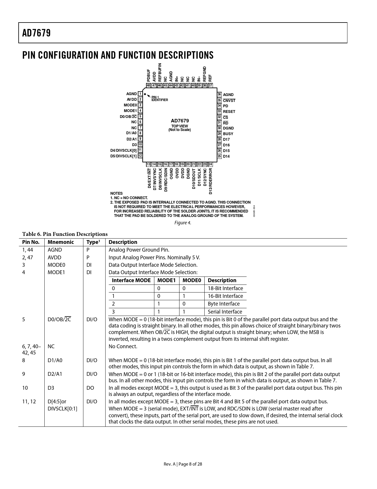 1, 44 AGND P Analog Power Ground Pin. 2, 47 AVDD P Input Analog Power Pins. Nominally 5 V. 3 MODE0 DI Data Output Interface Mode Selection. 4 MODE1 DI Data Output Interface Mode Selection: