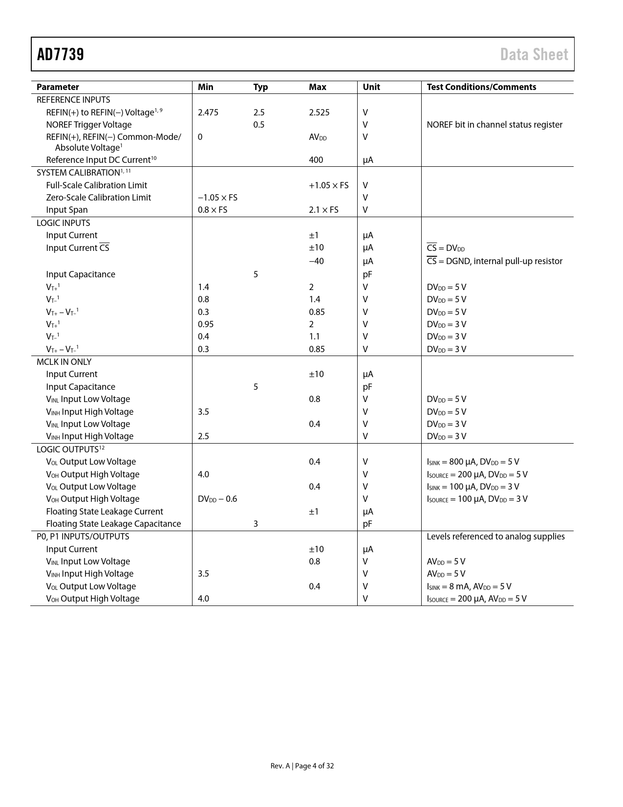 页数 / 页33 / 5 — AD7739. Data Sheet. Parameter Min. Typ. Max. Unit. Test. …