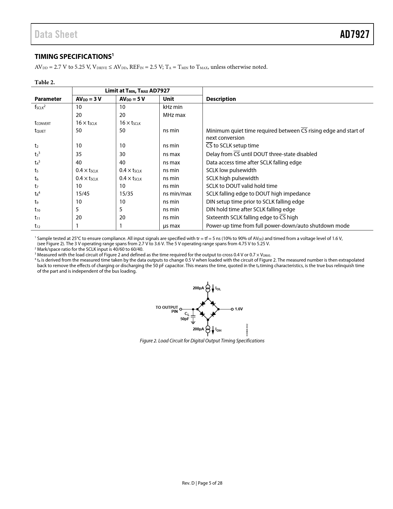 link to page 6 link to page 6 link to page 6 link to page 6 link to page 6 link to page 6 link to page 6 Data SheetAD7927TIMING SPECIFICATIONS1 AVDD = 2.7 V to 5.25 V, VDRIVE ≤ AVDD, REFIN = 2.5 V; TA = TMIN to TMAX, unless otherwise noted. Table 2.Limit at TMIN, TMAX AD7927ParameterAVDD = 3 VAVDD = 5 VUnitDescription f 2 SCLK 10 10 kHz min 20 20 MHz max tCONVERT 16 × tSCLK 16 × tSCLK tQUIET 50 50 ns min Minimum quiet time required between CS rising edge and start of next conversion t2 10 10 ns min CS to SCLK setup time t 3 3 35 30 ns max Delay from CS until DOUT three-state disabled t 3 4 40 40 ns max Data access time after SCLK falling edge t5 0.4 × tSCLK 0.4 × tSCLK ns min SCLK low pulsewidth t6 0.4 × tSCLK 0.4 × tSCLK ns min SCLK high pulsewidth t7 10 10 ns min SCLK to DOUT valid hold time t 4 8 15/45 15/35 ns min/max SCLK falling edge to DOUT high impedance t9 10 10 ns min DIN setup time prior to SCLK falling edge t10 5 5 ns min DIN hold time after SCLK falling edge t11 20 20 ns min Sixteenth SCLK falling edge to CS high t12 1 1 μs max Power-up time from full power-down/auto shutdown mode 1 Sample tested at 25°C to ensure compliance. All input signals are specified with tr = tf = 5 ns (10% to 90% of AVDD) and timed from a voltage level of 1.6 V, (see Figure 2). The 3 V operating range spans from 2.7 V to 3.6 V. The 5 V operating range spans from 4.75 V to 5.25 V. 2 Mark/space ratio for the SCLK input is 40/60 to 60/40. 3 Measured with the load circuit of Figure 2 and defined as the time required for the output to cross 0.4 V or 0.7 × VDRIVE. 4 t8 is derived from the measured time taken by the data outputs to change 0.5 V when loaded with the circuit of Figure 2. The measured number is then extrapolated back to remove the effects of charging or discharging the 50 pF capacitor. This means the time, quoted in the t8 timing characteristics, is the true bus relinquish time of the part and is independent of the bus loading. 200µAIOLTO OUTPUT1.6VPINCL50pF 02 200µAI 0 OH 8- 08 03 Figure 2. Load Circuit for Digital Output Timing Specifications Rev. D | Page 5 of 28 Document Outline Features General Description Functional Block Diagram Product Highlights Revision History Specifications Timing Specifications Absolute Maximum Ratings ESD Caution Pin Configuration and Function Descriptions Terminology Typical Performance Characteristics Control Register Sequencer Operation Shadow Register Circuit Information Converter Operation Analog Input ADC Transfer Function Handling Bipolar Input Signals Typical Connection Diagram Analog Input Selection Digital Inputs VDRIVE The Reference Modes of Operation Normal Mode (PM1 = PM0 = 1) Full Shutdown (PM1 = 1, PM0 = 0) Auto Shutdown (PM1 = 0, PM0 = 1) Powering Up the AD7927 Power vs. Throughput Rate Serial Interface Writing Between Conversions Microprocessor Interfacing AD7927 to TMS320C541 AD7927 to ADSP-21xx AD7927 to DSP563xx Application Hints Grounding and Layout Outline Dimensions Ordering Guide Automotive Products