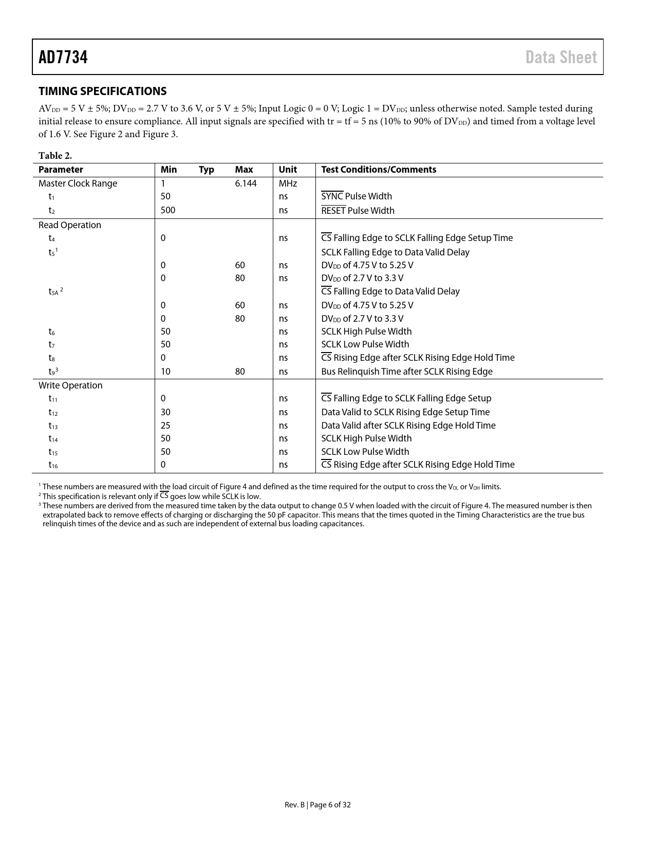 页数 / 页33 / 7 — AD7734. Data Sheet. TIMING SPECIFICATIONS. Table 2. Parameter. Min. Typ. …