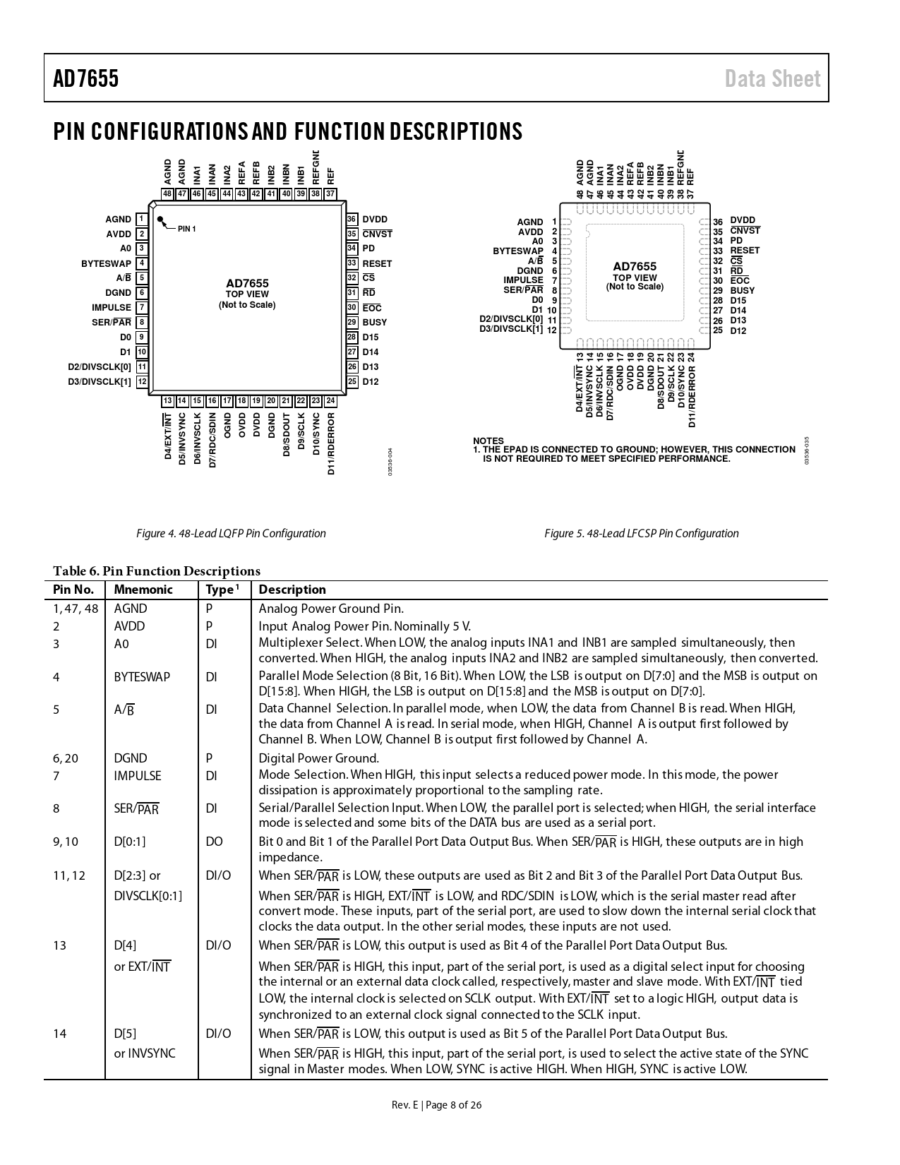 link to page 11 AD7655Data SheetPIN CONFIGURATIONS AND FUNCTION DESCRIPTIONSNDABGNDNDFFFFAGNDAGNDINA1INANINA2REFAREFBINB2INBNINB1REFGNDREFAGAGINA1INANINA2REREINB2INBNINB1RERE48 47 464544 43 4241 40 39 38 37484746454443424140393837AGND 136DVDDAGND136 DVDDPIN 1AVDD235 CNVSTAVDD235 CNVSTA0334 PDA0334PDBYTESWAP433 RESETBYTESWAP433 RESETA/B532 CSDGND6AD765531 RDA/B532 CSTOP VIEWAD7655IMPULSE730 EOC(Not to Scale)DGND631SER/PARTOP VIEWRD829 BUSYD0928 D15IMPULSE7(Not to Scale)30 EOCD1 1027 D14SER/PAR829 BUSYD2/DIVSCLK[0] 1126 D13D3/DIVSCLK[1] 1225 D12D0928D15D1 1027 D14131415161718192021222324D2/DIVSCLK[0] 1126 D13TKNDKRNCDIDDDDNDUTNCD3/DIVSCLK[1] 1225 D12YCLVCLYT/INSSSXOGNODVDGDOSSRROS13 14151617 18 1920 21 2223 24/EINVINVD9/4RDC/D8/D10/RDEDD5/D6/D7/D11/OGNDOVDDDVDDDGNDNOTESD9/SCLK 035 D10/SYNC1. THE EPAD IS CONNECTED TO GROUND; HOWEVER, THIS CONNECTIOND4/EXT/INTD8/SDOUTD5/INVSYNCD6/INVSCLKIS NOT REQUIRED TO MEET SPECIFIED PERFORMANCE.D7/RDC/SDIN 03536- D11/RDERROR 03536-004 Figure 4. 48-Lead LQFP Pin Configuration Figure 5. 48-Lead LFCSP Pin Configuration Table 6. Pin Function Descriptions Pin No.MnemonicType1Description 1, 47, 48 AGND P Analog Power Ground Pin. 2 AVDD P Input Analog Power Pin. Nominally 5 V. 3 A0 DI Multiplexer Select. When LOW, the analog inputs INA1 and INB1 are sampled simultaneously, then converted. When HIGH, the analog inputs INA2 and INB2 are sampled simultaneously, then converted. 4 BYTESWAP DI Parallel Mode Selection (8 Bit, 16 Bit). When LOW, the LSB is output on D[7:0] and the MSB is output on D[15:8]. When HIGH, the LSB is output on D[15:8] and the MSB is output on D[7:0]. 5 A/B DI Data Channel Selection. In parallel mode, when LOW, the data from Channel B is read. When HIGH, the data from Channel A is read. In serial mode, when HIGH, Channel A is output first followed by Channel B. When LOW, Channel B is output first followed by Channel A. 6, 20 DGND P Digital Power Ground. 7 IMPULSE DI Mode Selection. When HIGH, this input selects a reduced power mode. In this mode, the power dissipation is approximately proportional to the sampling rate. 8 SER/PAR DI Serial/Parallel Selection Input. When LOW, the parallel port is selected; when HIGH, the serial interface mode is selected and some bits of the DATA bus are used as a serial port. 9, 10 D[0:1] DO Bit 0 and Bit 1 of the Parallel Port Data Output Bus. When SER/PAR is HIGH, these outputs are in high impedance. 11, 12 D[2:3] or DI/O When SER/PAR is LOW, these outputs are used as Bit 2 and Bit 3 of the Parallel Port Data Output Bus. DIVSCLK[0:1] When SER/PAR is HIGH, EXT/INT is LOW, and RDC/SDIN is LOW, which is the serial master read after convert mode. These inputs, part of the serial port, are used to slow down the internal serial clock that clocks the data output. In the other serial modes, these inputs are not used. 13 D[4] DI/O When SER/PAR is LOW, this output is used as Bit 4 of the Parallel Port Data Output Bus. or EXT/INT When SER/PAR is HIGH, this input, part of the serial port, is used as a digital select input for choosing the internal or an external data clock called, respectively, master and slave mode. With EXT/INT tied LOW, the internal clock is selected on SCLK output. With EXT/INT set to a logic HIGH, output data is synchronized to an external clock signal connected to the SCLK input. 14 D[5] DI/O When SER/PAR is LOW, this output is used as Bit 5 of the Parallel Port Data Output Bus. or INVSYNC When SER/PAR is HIGH, this input, part of the serial port, is used to select the active state of the SYNC signal in Master modes. When LOW, SYNC is active HIGH. When HIGH, SYNC is active LOW. Rev. E | Page 8 of 26 Document Outline FEATURES APPLICATIONS GENERAL DESCRIPTION FUNCTIONAL BLOCK DIAGRAM PRODUCT HIGHLIGHTS REVISION HISTORY SPECIFICATIONS TIMING SPECIFICATIONS ABSOLUTE MAXIMUM RATINGS ESD CAUTION PIN CONFIGURATIONS AND FUNCTION DESCRIPTIONS TERMINOLOGY TYPICAL PERFORMANCE CHARACTERISTICS APPLICATIONS INFORMATION CIRCUIT INFORMATION MODES OF OPERATION TRANSFER FUNCTIONS TYPICAL CONNECTION DIAGRAM ANALOG INPUTS INPUT CHANNEL MULTIPLEXER DRIVER AMPLIFIER CHOICE VOLTAGE REFERENCE INPUT POWER SUPPLY POWER DISSIPATION CONVERSION CONTROL DIGITAL INTERFACE PARALLEL INTERFACE Master Parallel Interface Slave Parallel Interface 8-Bit Interface (Master or Slave) Channel A/ Output SERIAL INTERFACE MASTER SERIAL INTERFACE Internal Clock SLAVE SERIAL INTERFACE External Clock External Discontinuous Clock Data Read After Convert External Clock Data Read (Previous) During Convert MICROPROCESSOR INTERFACING SPI INTERFACE (ADSP-2191M) APPLICATION HINTS LAYOUT EVALUATING THE AD7655 PERFORMANCE OUTLINE DIMENSIONS ORDERING GUIDE