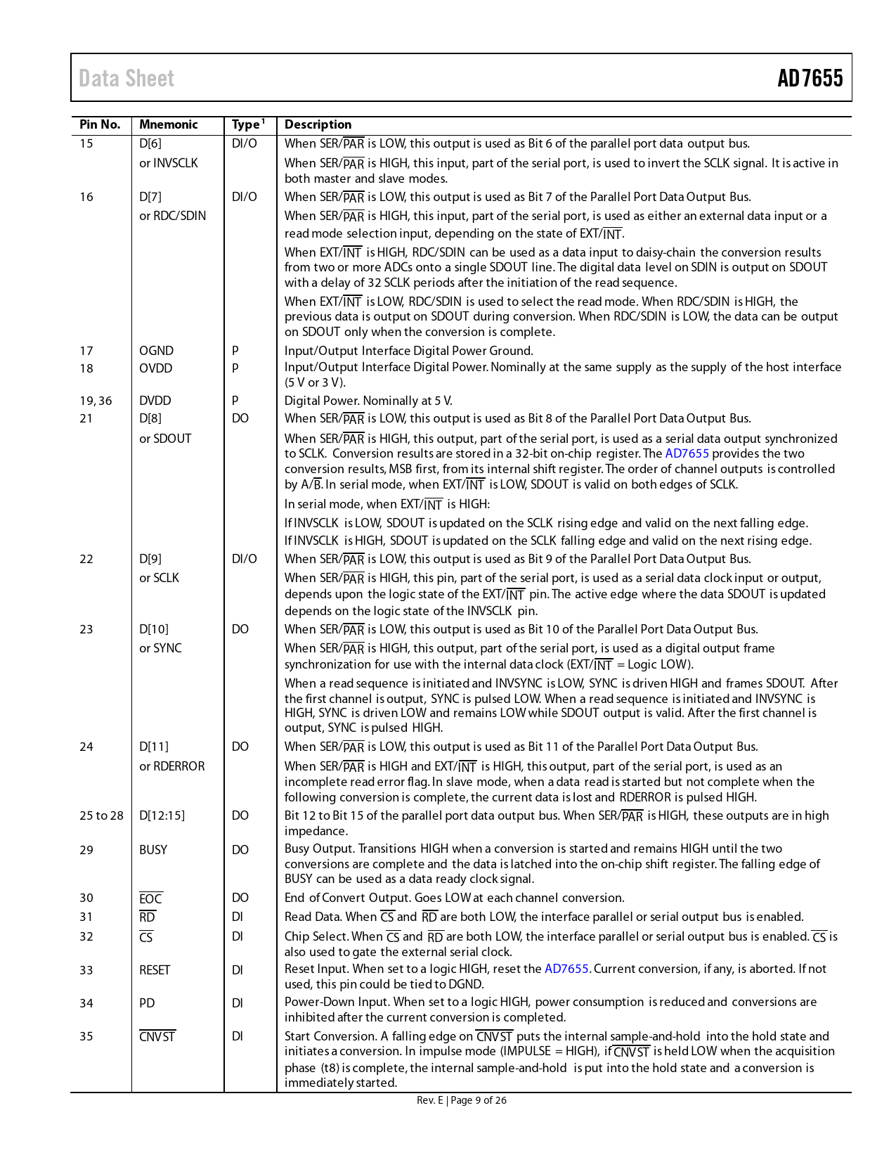 Data Sheet AD7655 Pin No Mnemonic Type1 Description